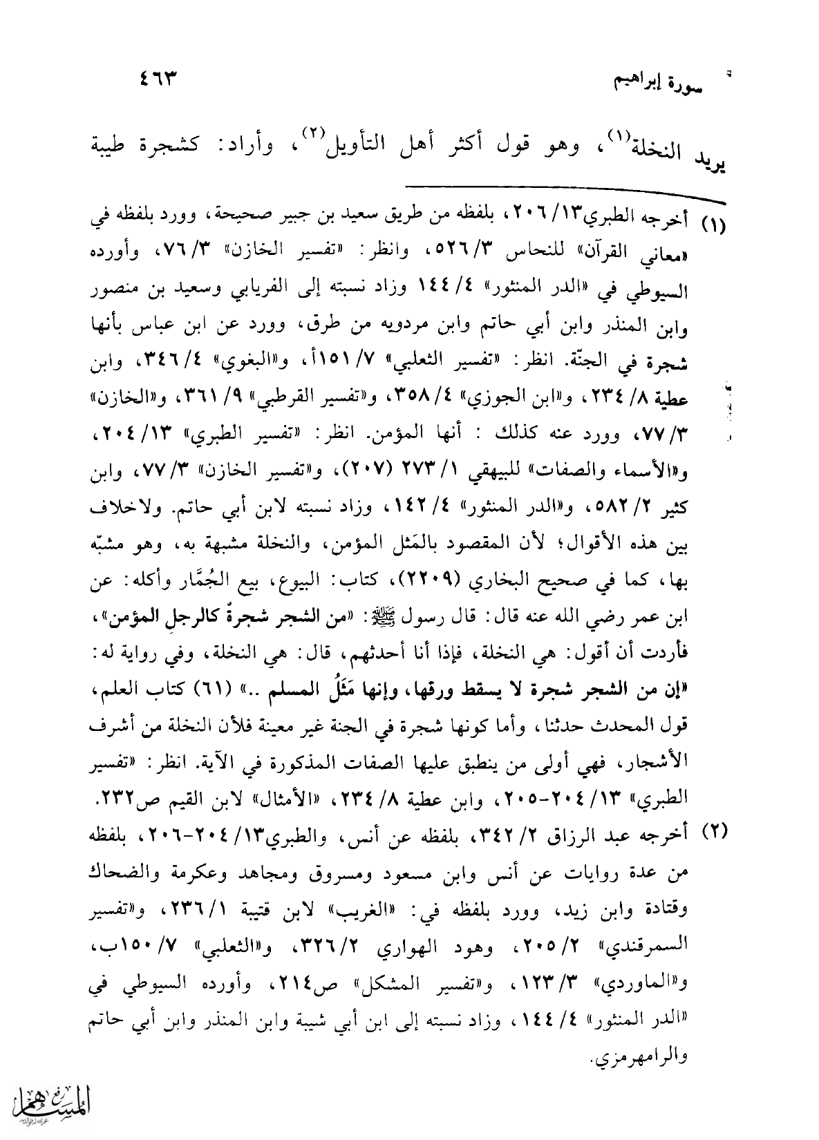 (¬1) أخرج الطبري 13/ 206، بلفظه من طريق سعيد بن جبير صحيحة، وورد بلفظه في "معاني القرآن" للنحاس 3/ 526، وانظر: "تفسير الخازن" 3/ 76، وأورده السيوطي في "الدر المنثور" 4/ 144 وزاد نسبته إلى الفريابي وسعيد بن منصور وابن المنذر وابن أبي هاشم وابن مردويه من طرق، وورد عن ابن عباس بأنها شجرة في الجنّة. انظر: "تفسير الثعلبي" 7/ 151 أ، و"البغوي" 4/ 346، وابن عطية 8/ 234، و"ابن الجوزي" 4/ 358، و"تفسير القرطبي" 9/ 361، و"الخازن" 3/ 77، وورد عنه كذلك: أنها المؤمن. انظر: "تفسير الطبري" 13/ 204، و"الأسماء والصفات" للبيهقي 1/ 273 (207)، و"تفسير الخازن" 3/ 77، وابن كثير 2/ 582، و"الدر المنثور" 4/ 142، وزاد نسبته لابن أبي حاتم. ولاخلاف بين هذه الأقوال؛ لأن المقصود بالمثل المؤمن، والنخلة مشبهة به، وهو مشبّه بها، كما في صحيح البخاري (2209)، كتاب: البيوع، بيع الجُمَّار وأكله: عن ابن عمر رضي الله عنه قال: قال رسول - صلى الله عليه وسلم -: "من الشجر شجرةٌ كالرجلِ المؤمن"، فأردت أن أقول: هي النخلة، فإذا أنا أحدثهم، قال: هي النخلة، وفي رواية له: "إن من الشجر شجرة لا يسقط ورقها، وإنها مَثَلُ المسلم .. " (61) كتاب العلم، قول المحدث حدثنا، وأما كونها شجرة في الجنة غير معينة فلأن النخلة من أشرف الأشجار، فهي أولى من ينطبق عليها الصفات المذكورة في الآية. انظر: "تفسير الطبري" 13/ 204 - 205، وابن عطية 8/ 234، "الأمثال" لابن القيم ص 232.