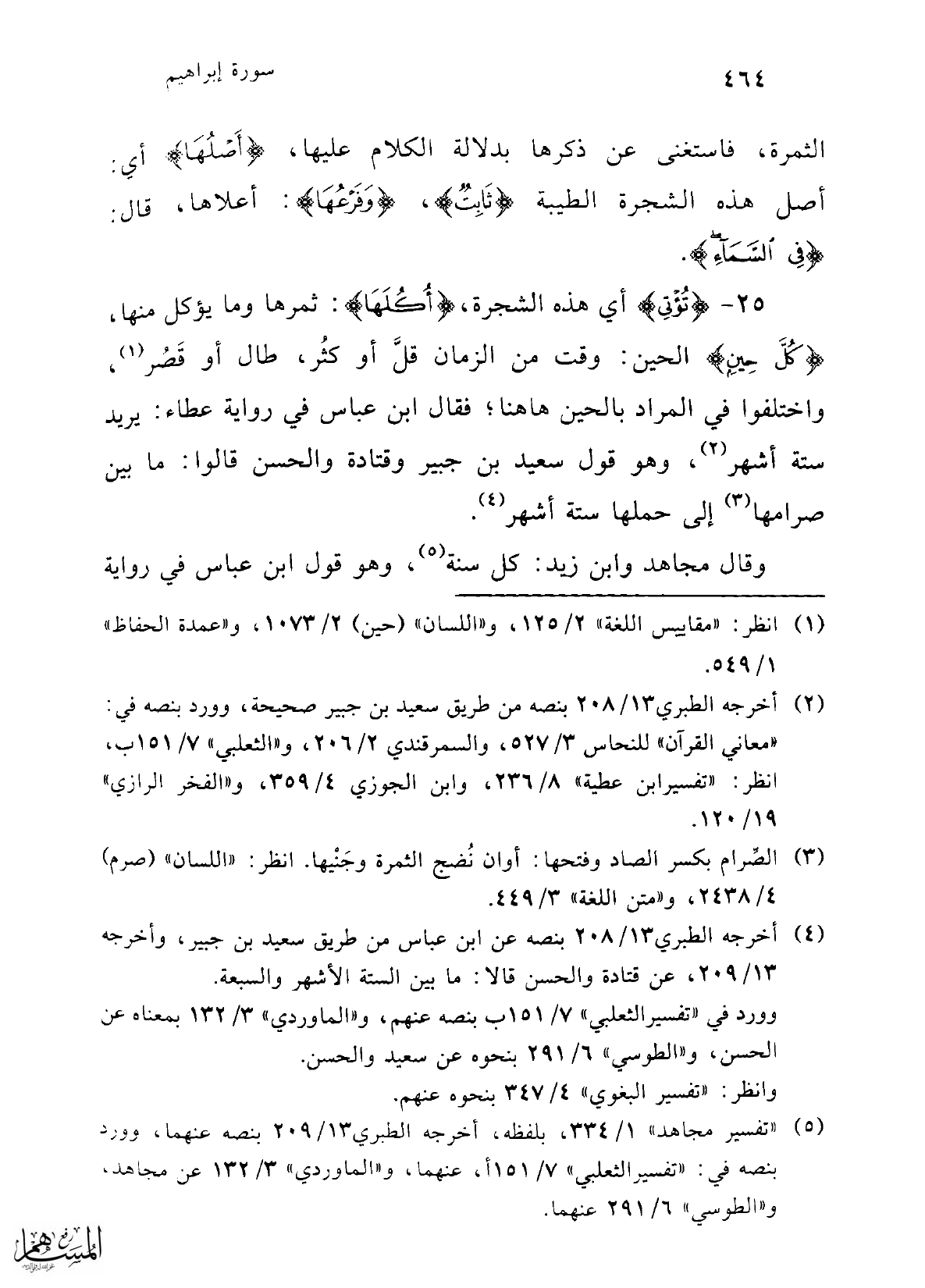 25 - {تُؤْتِي} أي هذه الشجرة، {أُكُلَهَا}: ثمرها وما يؤكل منها، {كُلَّ حِينٍ} الحين: وقت من الزمان قلَّ أو كثُر، طال أو قَصُر (¬1)، واختلفوا في المراد بالحين هاهنا؛ فقال ابن عباس في رواية عطاء: يريد ستة أشهر (¬2)، وهو قول سعيد بن جبير وقتادة والحسن قالوا: ما بين صرامها (¬3) إلى حملها ستة أشهر (¬4).
