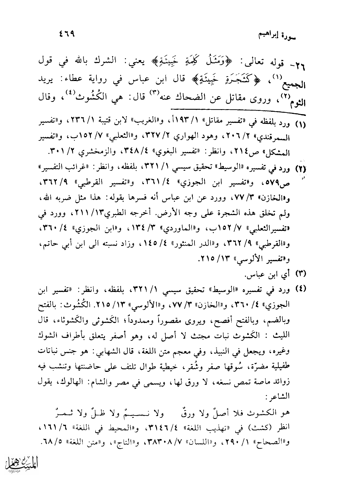 (¬4) ورد في تفسيره "الوسيط" تحقيق سيسي 1/ 321، بلفظه، وانظر: "تفسير ابن الجوزي" 4/ 360، و"الخازن" 3/ 77، و"الألوسي" 13/ 215 الكُشُوث: بالفتح وبالضم، وبالفتح أفصح، ويروى مقصوراً وممدوداً؛ الكَشوثى والكَشوثاء، قال الليث: الكَشوث نبات مجتث لا أجل له، وهو أصفر يتعلق بأطراف الشوك وغيره، ويجعل في النبيذ، وفي معجم متن اللغة، قال الشهابي: هو جنس نباتات طفيلية مضرّة، سُوقها صفر وشُقر، خيطية طوال تتف على حاضنتها وتنشب فيه زوائد ماصة تمص نسغه، لا ورق لها، ويسمى في مصر والشام: الهالوك، يقول الشاعر: