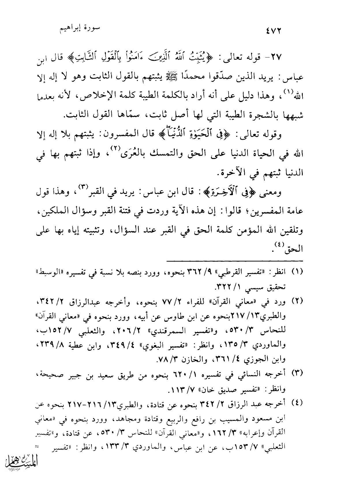 27 - قوله تعالى: {يُثَبِّتُ اللَّهُ الَّذِينَ آمَنُوا بِالْقَوْلِ الثَّابِتِ} قال ابن عباس: يريد الذين صدّقوا محمدًا - صلى الله عليه وسلم - يثبتهم بالقول الثابت وهو لا إله إلا الله (¬1)، وهذا دليل على أنه أراد بالكلمة الطيبة كلمة الإخلاص؛ لأنه بعدما شبهها بالشجرة الطيبة التي لها أصل ثابت، سمّاها القول الثابت.
