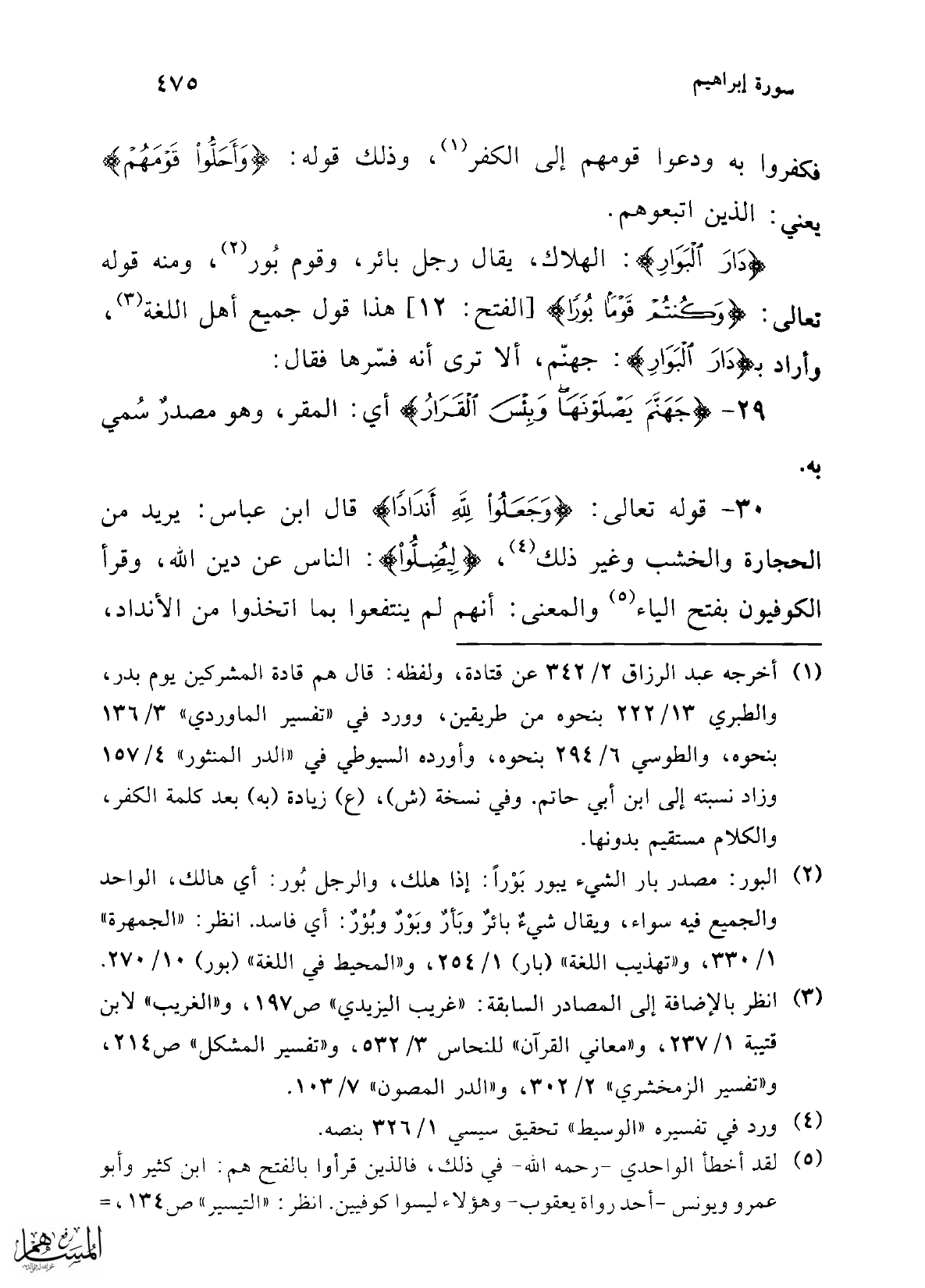 (¬3) انظر بالإضافة إلى المصادر السابقة: "غريب اليزيدي" ص 197، و"الغريب" لابن قتيبة 1/ 237، و"معاني القرآن" للنحاس 3/ 532، و"تفسير المشكل" ص 214، و"تفسير الزمخشري" 2/ 302، و"الدر المصون" 7/ 103.