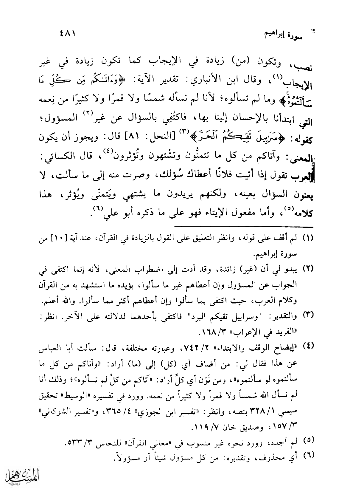 (¬4) "إيضاح الوقف والابتداء" 2/ 742، وعبارته مختلفة، قال: سألت أبا العباس عن هذا فقال لي: من أضاف أي (كل) إلى (ما) أراد: "وآتاكم من كل ما سألتموه لو سألتموه"، ومن نَوّن أي كلٍّ أراد: "آتاكم من كلٍّ لم تسألوه"، وذلك أنا لم نسأل الله شمساً ولا قمراً ولا كثيراً من نعمه. وورد في تفسيره "الوسيط" تحقيق سيسي 1/ 328 بنصه، وانظر: "تفسير ابن الجوزي" 4/ 365، و"تفسير الشوكاني" 3/ 157، وصديق خان 7/ 119.
