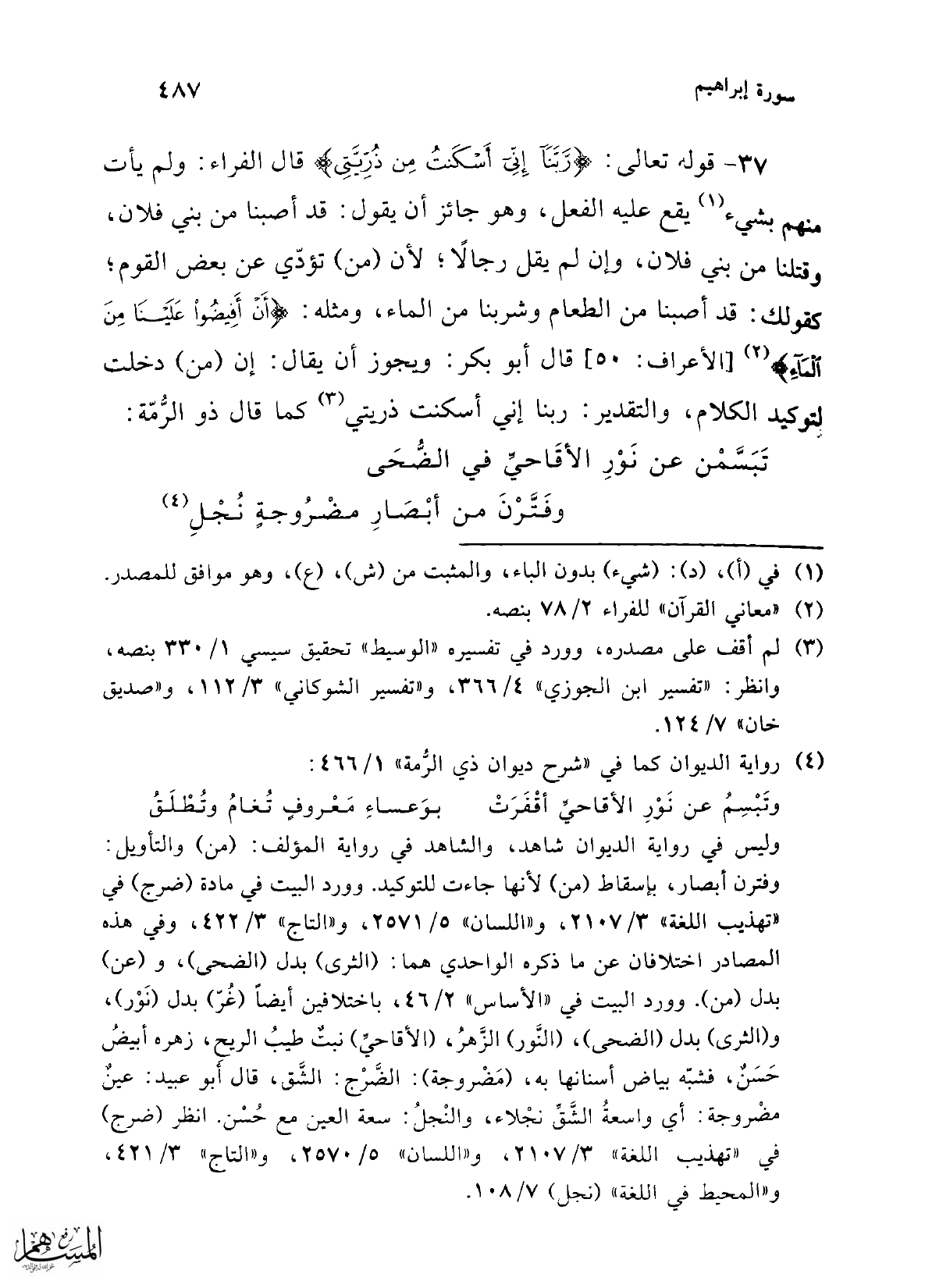 37 - قوله تعالى: {رَبَّنَا إِنِّي أَسْكَنْتُ مِنْ ذُرِّيَّتِي} قال الفراء: ولم يأت منهم بشىء (¬1) يقع عليه الفعل، وهو حائز أن يقول: قد أصبنا من بنى فلان، وقتلنا من بني فلان، وإن لم يقل رجالاً؛ لأن (من) تؤدّي عن بعض القوم؛ كقولك: قد أصبنا من الطعام وشربنا من الماء، ومثله: {أَنْ أَفِيضُوا عَلَيْنَا مِنَ الْمَاءِ} (¬2) [الأعراف: 50] قال أبو بكر: ويجوز أن يقال: إن (من) دخلت لتوكيد الكلام، والتقدير: ربنا إني أسكنت ذريتي (¬3) كما قال ذو الرُّمّة: