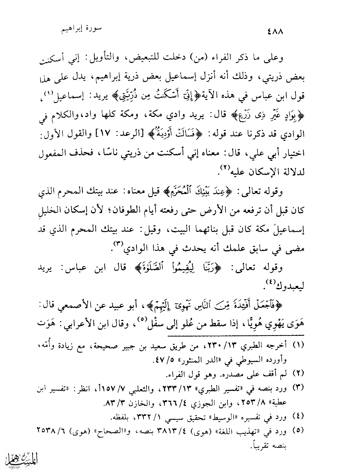 وعلى ما ذكر الفراء (من) دخلت للتبعيض، والتأويل: إني أسكنت بعض ذريتي، وذلك أنه أنزل إسماعيل بعض ذرية إبراهيم، يدل على هذا قول ابن عباس في هذه الآية {إِنِّي أَسْكَنْتُ مِنْ ذُرِّيَّتِي} يريد: إسماعيل (¬1)، {بِوَادٍ غَيْرِ ذِي زَرْعٍ} قال: يريد وادي مكة، ومكة كلها واد، والكلام في الوادي قد ذكرنا عند قوله: {فَسَالَتْ أَوْدِيَةٌ} [الرعد: 17] والقول الأول: اختيار أبي علي، قال: معناه إني أسكنت من ذريتي ناسًا، فحذف المفعول لدلالة الإسكان عليه (¬2).