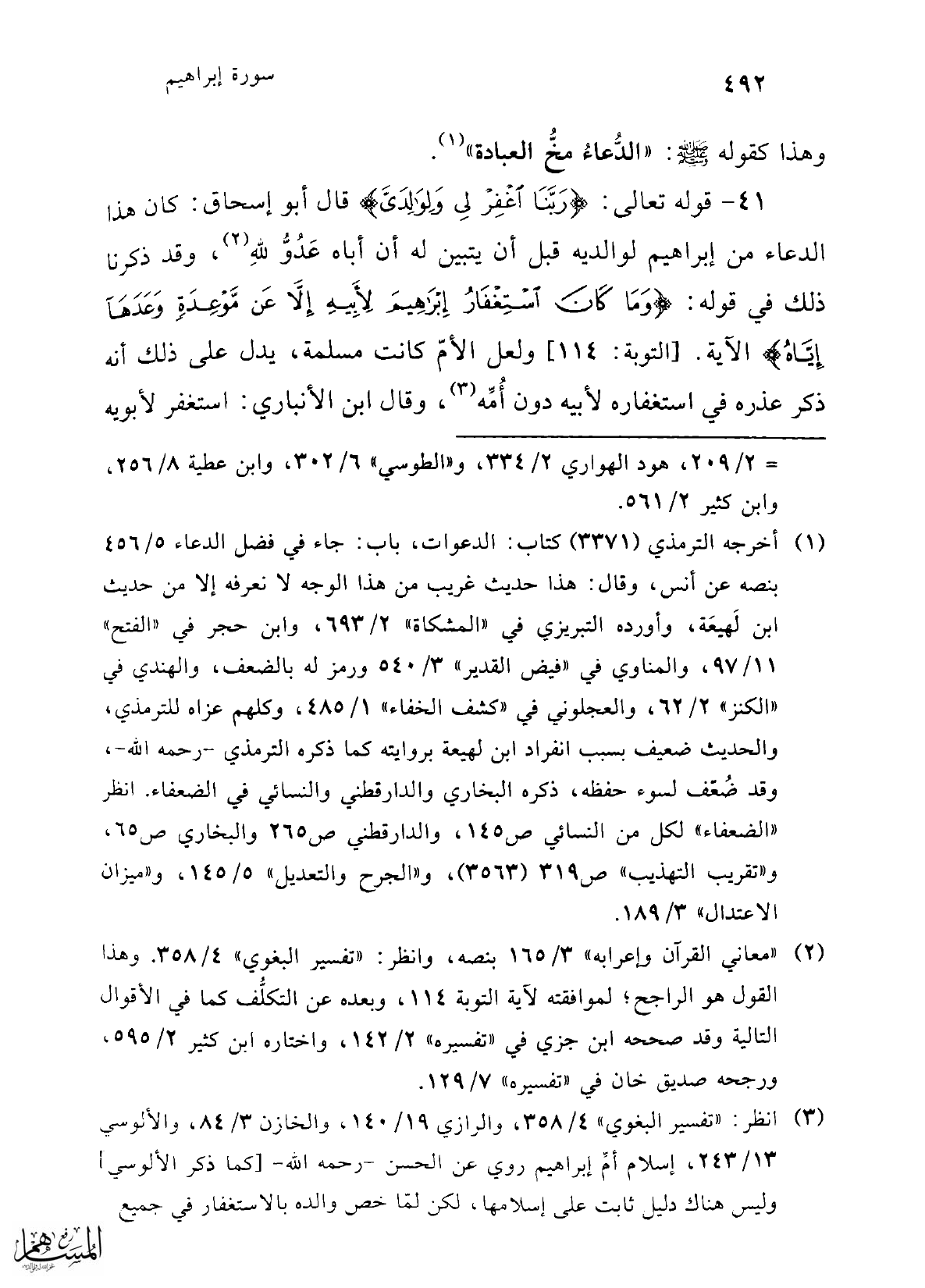 (¬3) انظر: "تفسير البغوي" 4/ 358، والرازي 19/ 140، والخارن 3/ 84، والألوسي 13/ 243، إسلام أمِّ إبراهيم روي عن الحسن -رحمه الله-[كما ذكر الألوسي] وليس هناك دليل ثابت علي إسلامها، لكن لمّا خصر والده بالاستغفار في جميع =
