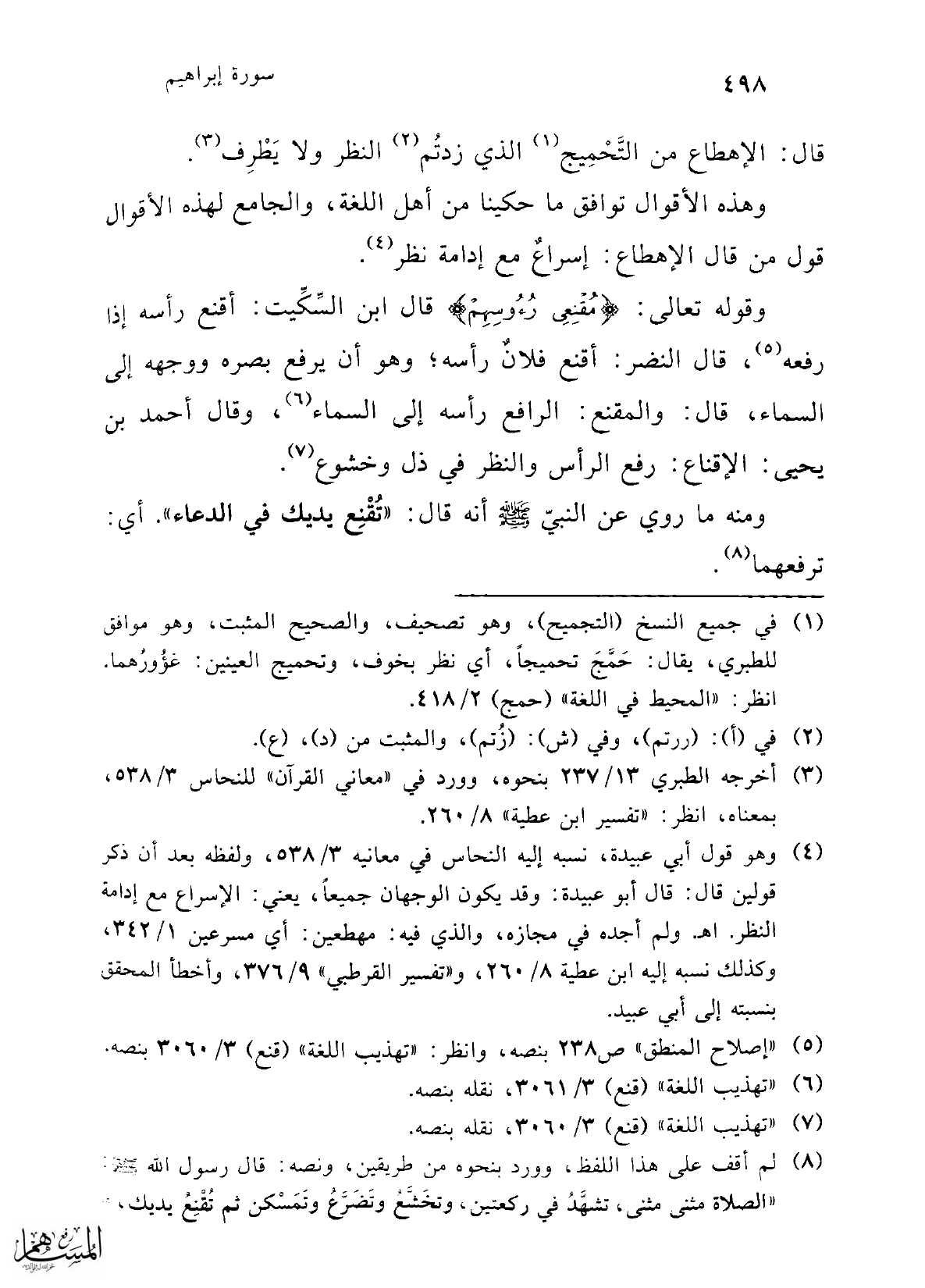 (¬4) وهو قول أبي عبيدة، نسبه إليه النحاس في معانيه 3/ 538، ولفظه بعد أن ذكر قولين قال: قال أبو عبيدة: وقد يكون الوجهان جميعاً، يعني: الإسراع مع إدامة النظر. اهـ. ولم أجده في مجازه، والذي فيه: مهطعين: أي مسرعين 1/ 342، وكذلك نسبه إليه ابن عطية 8/ 260، و"تفسير القرطبي" 9/ 376، وأخطأ المحقق بنسبته إلى أبي عبيد.