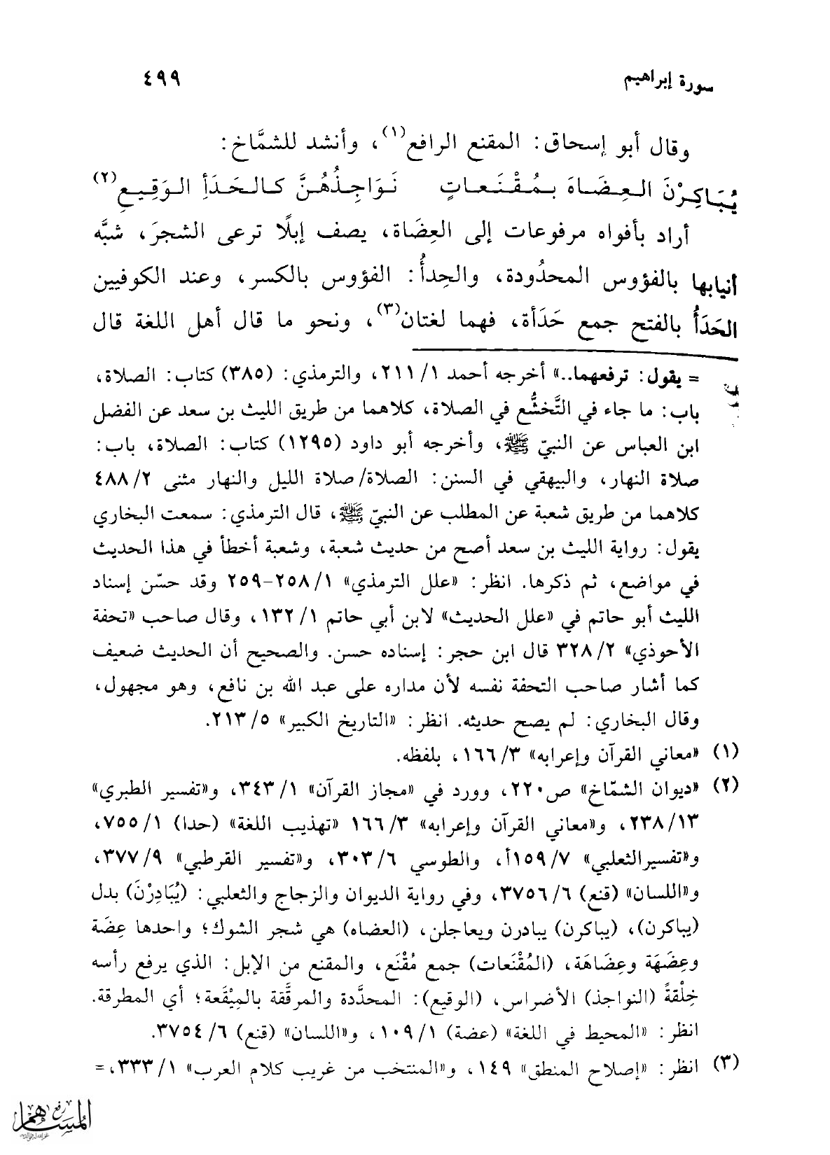 (¬2) "ديوان الشمّاخ" ص 220، وورد في "مجاز القرآن" 1/ 343، و"تفسير الطبري" 13/ 238، و"معاني القرآن وإعرابه" 3/ 166 "تهذيب اللغة" (حدا) 1/ 755، و"تفسيرالثعلبي" 7/ 159أ، والطوسي 6/ 303، و"تفسير القرطبي" 9/ 377، و"اللسان" (قنع) 6/ 3756، وفي رواية الديوان والزجاج والثعلبي: (يُبَادرْنَ) بدل (يباكرن)، (يباكرن) يبادرن ويعاجلن، (العضاه) هي شجر الشوك؛ واحدها عِضَة وعِضَهَة وعِضَاهَة، (المُقْنَعات) جمع مقْنَع، والمحضع من الإبل: الذي يرفع رأسه خِلْقةً (النواجذ) الأضراس، (الوقيع): المحدَّدة والمرقَّقة بالمِيْقَعة، أي المطرقة. انظر: "المحيط في اللغة" (عضة) 1/ 109، و"اللسان" (قنع) 6/ 3754.