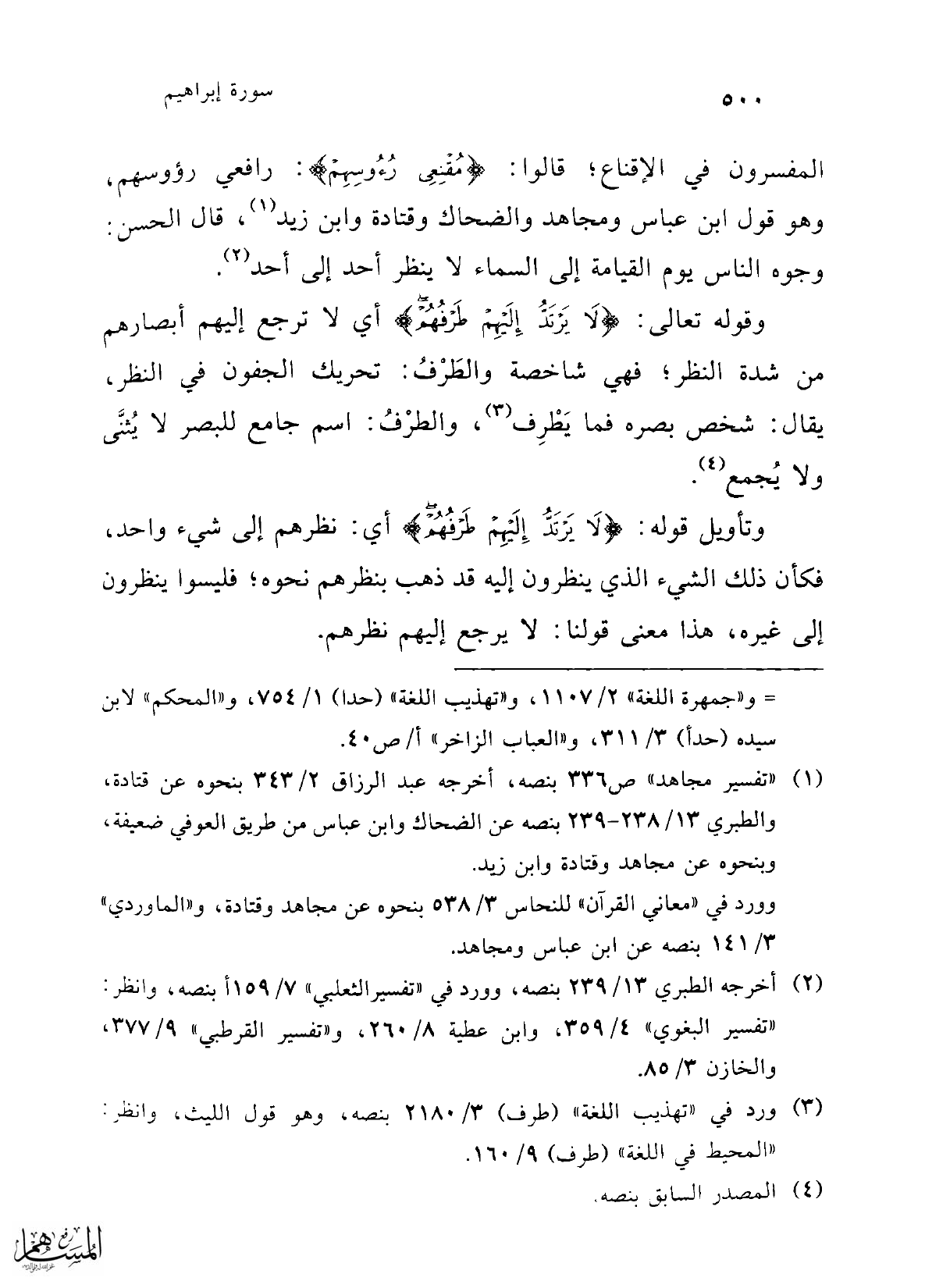 وقوله تعالى: {لَا يَرْتَدُّ إِلَيْهِمْ طَرْفُهُمْ} أي لا ترجع إليهم أبصارهم من شدة النظر؛ فهي شاخصة والطَرْفُ: تحريك الجفون في النظر، يقال: شخص بصره فما يَطْرِف (¬3)، والطرْفُ: اسم جامع للبصر لا يُثنَى ولا يُجمع (¬4).