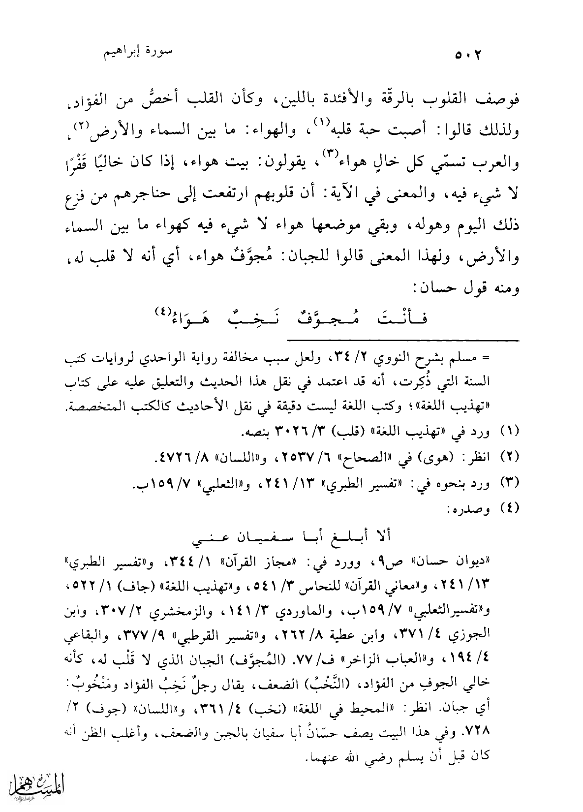 فوصف القلوب بالرقّة والأفئدة باللين، وكأن القلب أخصُّ منا لفؤاد، ولذلك قالوا: أصبت حبة قلبه (¬1)، والهواء: ما بين السماء والأرض (¬2)، والعرب تسمّي كل خالٍ هواء (¬3)، يقولون: بيت هواء، إذا كان خاليًا قفْرًا لا شيء فيه، والمعنى في الآية: أن قلوبهم ارتفعت إلى حناجرهم من فزع ذلك اليوم وهوله، وبقي موضعها هواء لا شيء فيه كهواء ما بين السماء والأرض، ولهذا المعنى قالوا للجبان: مُجوَّفٌ هواء، أي أنه لا قلب له، ومنه قول حسان: