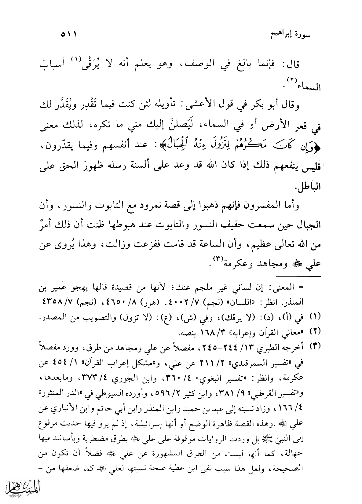 وقال أبو بكر في قول الأعشى: تأويله لئن كنت فيما تَقْدِر ويُقَدَّر لك في قعر الأرض أو في السماء، لَيَصلنَّ إليك مني ما كره، لذلك معنى {وَإِنْ كَانَ مَكْرُهُمْ لِتَزُولَ مِنْهُ الْجِبَالُ}: عند أنفسهم وفيما يقدّرون، فليس ينفعهم ذلك إذا كان الله قد وعد على ألسنة رسله ظهورَ الحق على الباطل.