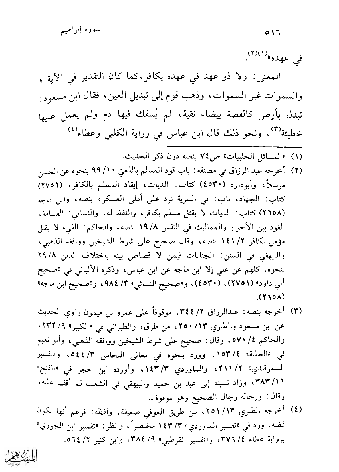 (¬2) أخرجه عبد الرزاق في مصنفه: باب قود المسلم بالذمي 10/ 99 بنحوه عن الحسن مرسلاً، وأبو داود (4530) كتاب: الديات، إيقاد المسلم بالكافر، (2751) كتاب: الجهاد، باب: في السرية ترد على أملى العسكر، بنصه، وابن ماجه (2658) كتاب: الديات لا يقتل مسلم بكافر، واللفظ له، والنسائي: القَسامة، القود بين الأحرار والمماليك في النفس 8/ 19 بنصه، والحاكم: الفيء لا يقتل مؤمن بكافر 2/ 141 بنصه، وقال صحيح على شرط الشيخين ووافقه الذهبي، والبيهقي في السنن: الجنايات فيمن لا قصاص بينه باختلاف الدين 8/ 29 بنحوه، كلهم عن علي إلا ابن ماجه عن ابن عباس، وذكره الألباني في "صحيح أبي داود" (2751)، (4530)، و"صحيح النسائي" 3/ 984، و"صحيح ابن ماجه" (2658).