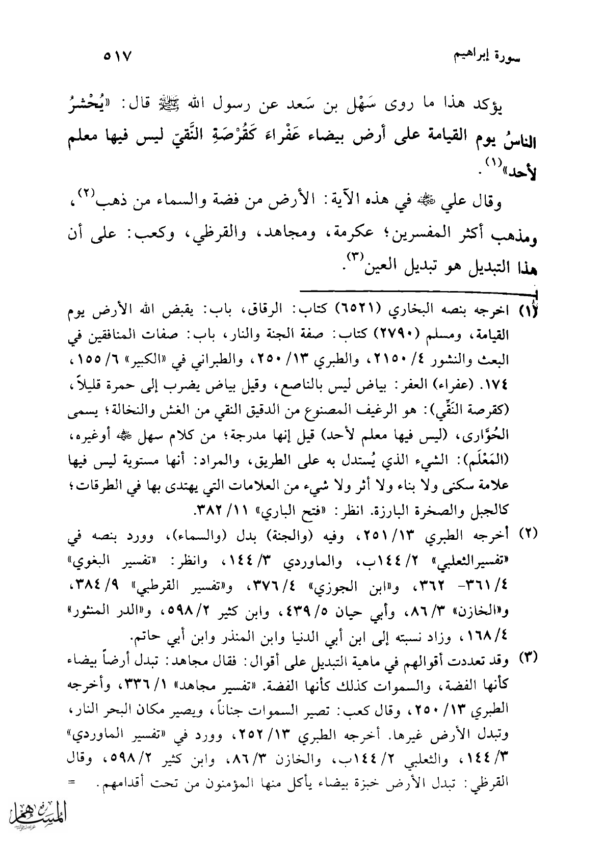 (¬1) أخرجه بنصه البخاري (6521) كتاب: الرقاق، باب: يقبض الله الأرض يوم القيامة، ومسلم (2790) كتاب: صفة الجنة والنار، باب: صفات المنافقين في البعث والنشور 4/ 2150، والطبري 13/ 250، والطبراني في "الكبير" 6/ 155، 174. (عفراء) العفر: بياض ليس بالناصع، وقيل بياض يضرب إلى حمرة قليلاً، (كقرصة النَقِّي): هو الرغيف المصنوع من الدقيق النقي من الغش والنخالة؛ يسمى الحُوَّارى، (ليس فيها معلم لأحد) قيل إنها مدرجة؛ من كلام سهل -رضي الله عنه- أو غيره، (المَعْلَم):الشيء الذي يُستدل به على الطريق، والمراد: أنها مستوية ليس فيها علامة سكنى ولا بناء ولا أثر ولا شيء من العلامات التي يهتدى بها في الطرقات؛ كالجبل والصخرة البارزة انظر: "فتح الباري" 11/ 382.