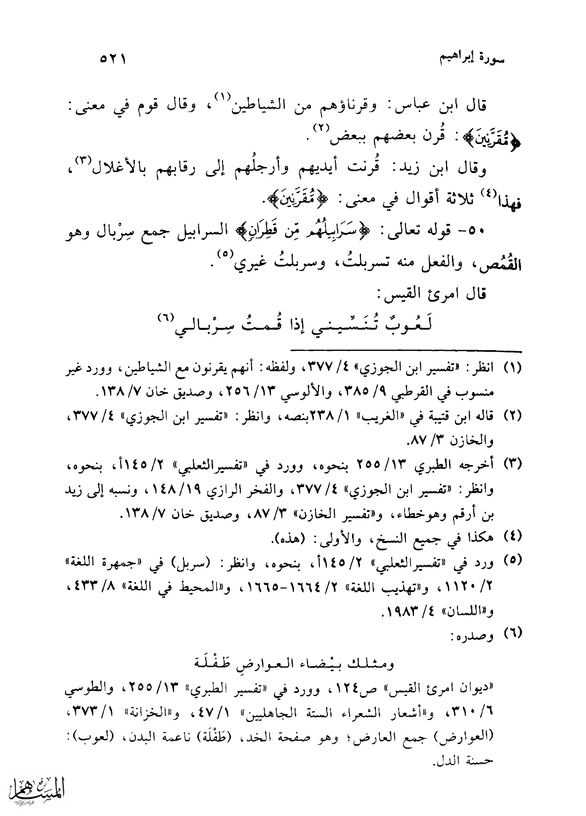 (¬5) ورد في "تفسير الثعلبي" 2/ 145 أ، بنحوه، وانظر: (سربل) في "جمهرة اللغة" 2/ 1120، و"تهذيب اللغة" 2/ 1664 - 1665، و"المحيط في اللغة" 8/ 433، و"اللسان" 4/ 1983.