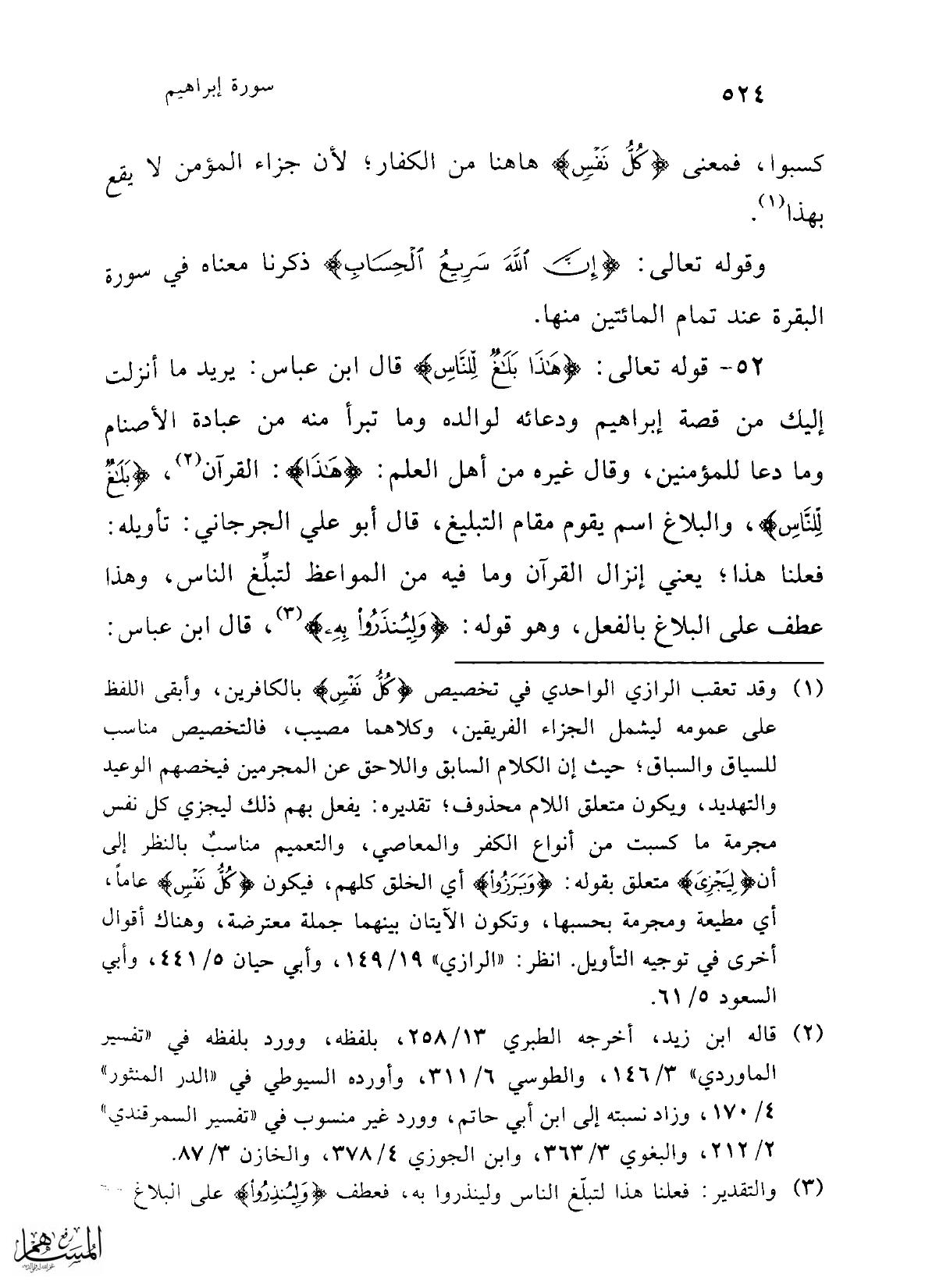 (¬1) وقد تعقب الرازي الواحدي في تخصيص {كُلَّ نَفْسٍ} بالكافرين، وأبقى اللفظ على عمومه ليشمل الجزاء الفريقين، وكلاهما مصيب، فالتخصيص مناسب للسياق والسباق؛ حيث إن الكلام السابق واللاحق عن المجرمين فيخصهم الوعيد والتهديد، ويكون متعلق اللام محذوف؛ تقديره: يفعل بهم ذلك ليجزي كل نفس مجرمة ما كسبت من أنواع الكفر والمعاصي، والتعميم مناسبٌ بالنظر إلى أن {لِيَجْزِيَ} متعلق بقوله: {وَبَرَزُوا} أي الخلق كلهم، فيكون {كُلَّ نَفْسٍ} عامًا، أي مطيعة ومجرمة بحسبها، وتكون الآيتان بينهما جملة معترضة، وهناك أقوال أخرى في توجيه التأويل. انظر: "الرازي" 19/ 149، وأبي حيان 5/ 441، وأبي السعود 5/ 61.