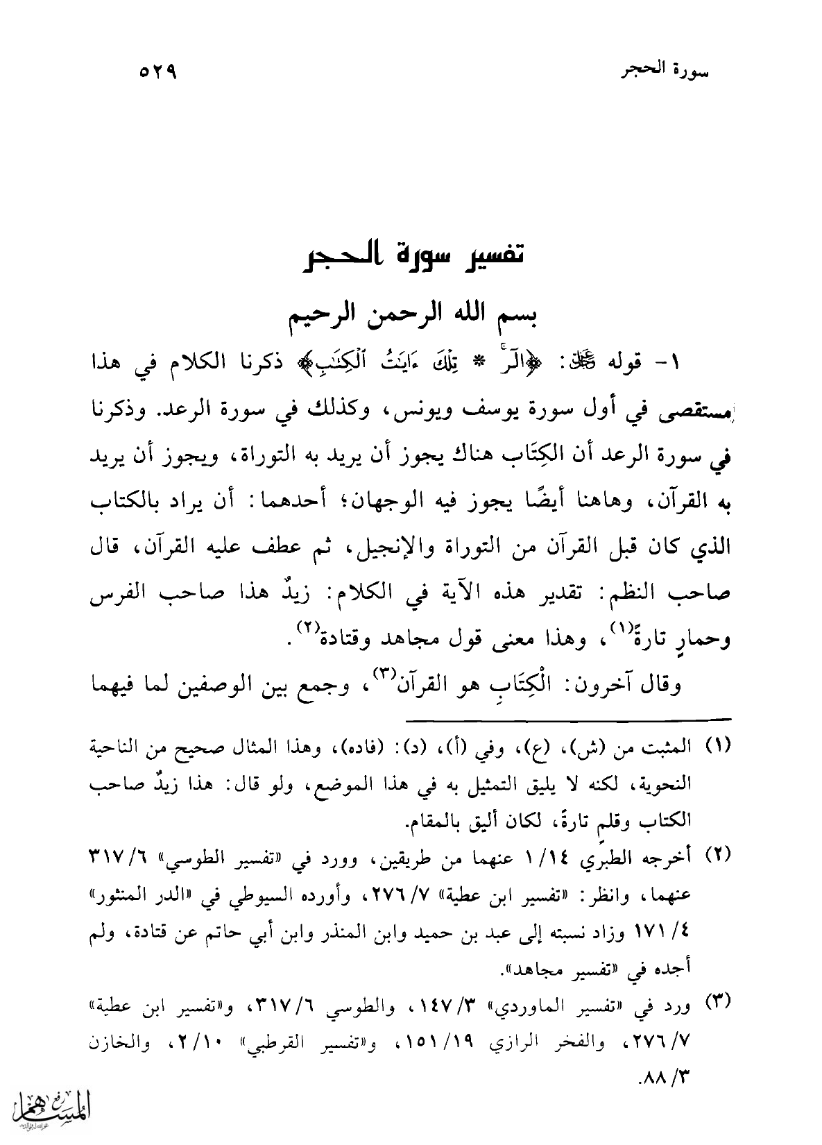 1 - قوله -عز وجل-: {الر تِلْكَ آيَاتُ الْكِتَابِ} ذكرنا الكلام في هذا مستقصى في أول سورة يوسف ويونس، وكذلك في سورة الرعد. وذكرنا في سورة الرعد أن الكِتَاب هناك يجوز أن يريد به التوراة، ويجوز أن يريد به القرآن، وهاهنا أيضاً يجوز فيه الوجهان؛ أحدهما: أن يراد بالكتاب الذي كان قبل القرآن من التوراة والإنجيل، ثم عطف عليه القرآن، قال صاحب النظم: تقدير هذه الآية في الكلام: زيدٌ هذا صاحب الفرس وحمارٍ تارةً (¬1)، وهذا معنى قول مجاهد وقتادة (¬2).