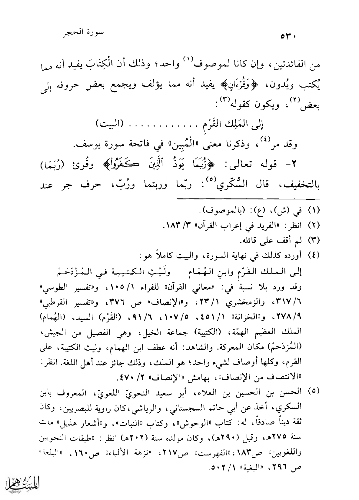 2 - قوله تعالى: {رُبَمَا يَوَدُّ الَّذِينَ كَفَرُوا} وقُرئ {رُبَمَا} بالتخفيف، قال السُّكّري (¬5): ربّما وربتما ورُبّ، حرف جر عند