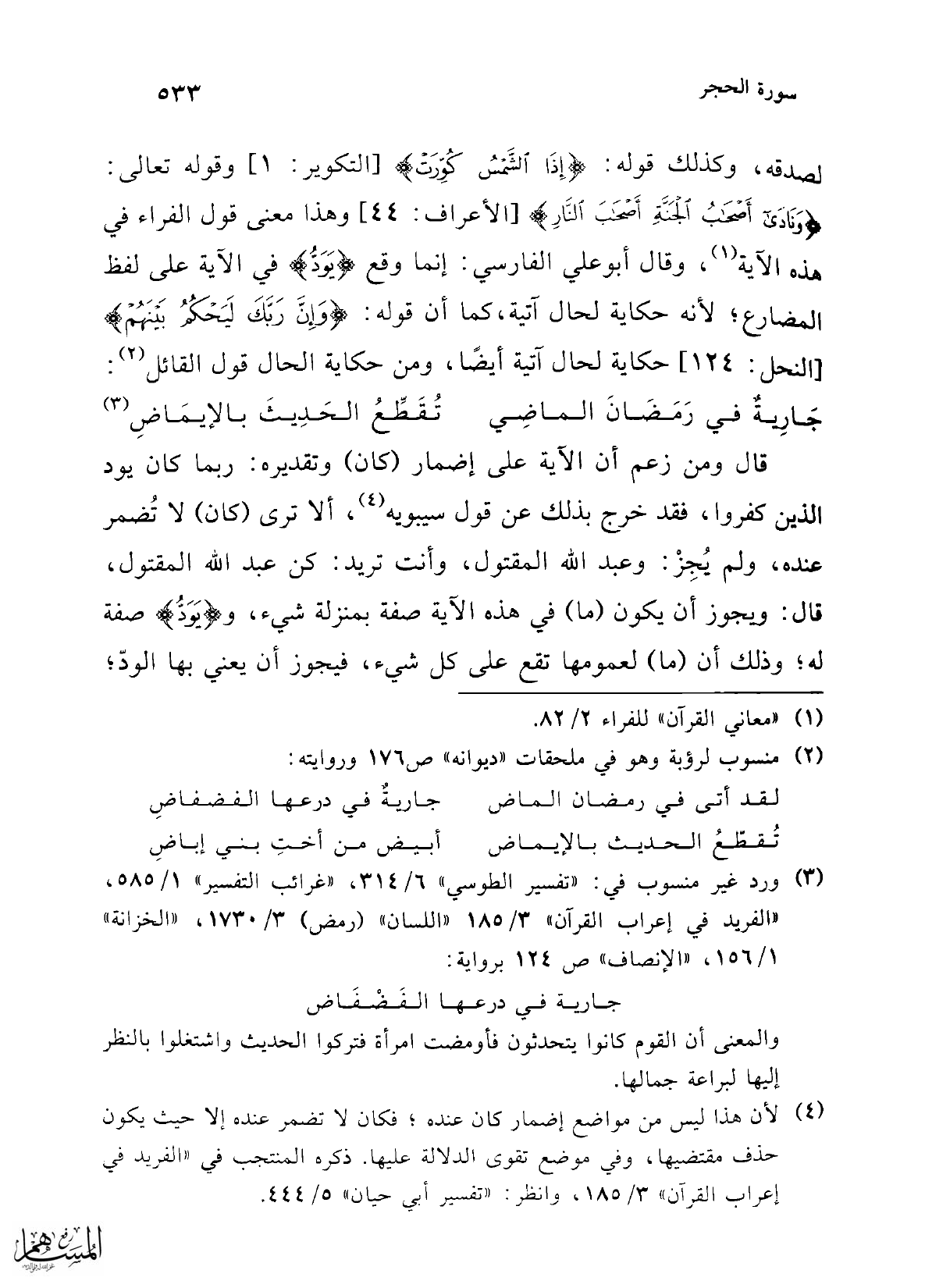 قال ومن زعم أن الآية على إضمار (كان) وتقديره: ربما كان يود الذين كفروا، فقد خرج بذلك عن قول سيبويه (¬4)، ألا ترى (كان) لا تُضمر عنده، ولم يُجِزْ: وعبد الله المقتول، وأنت تريد: كن عبد الله المقتول، قال: ويجوز أن يكون (ما) في هذه الآية صفة بمنزلة شيء، و {يَوَدُّ} صفة له؛ وذلك أن (ما) لعمومها تقع على كل شيء، فيجوز أن يعني بها الودّ؛