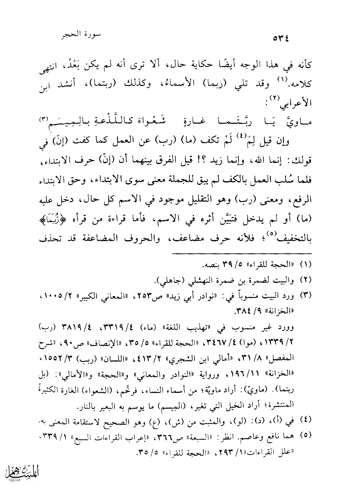 (¬3) ورد البيت منسوباً في: "نوادر أبي زيد" ص 253، "المعاني الكبير" 2/ 1005، "الخزانة" 9/ 384. وورد غير منسوب في "تهذيب اللغة" (ماء) 9/ 3314، 9/ 3814 (رب) 2/ 1339، (موا) 4/ 3467، "الحجة للقراء" 5/ 35، "الإنصاف" ص90، "شرح المفصل" 8/ 31، "أمالي ابن الشجري" 2/ 413، "اللسان" (ربب) 3/ 1552، "الخزانة" 11/ 196، ورواية "النوادر والمعاني" و"الحجة" و"الأمالي": (بل ربتما). (ماويّ): أراد ماويّ؛ من أسماء النساء، فرخَّم، (الشعواء) الغارة الكثيرة المنتشرة؛ أراد الخيل التي تغير، (المِيسم) ما يوسم به البحير بالنار.