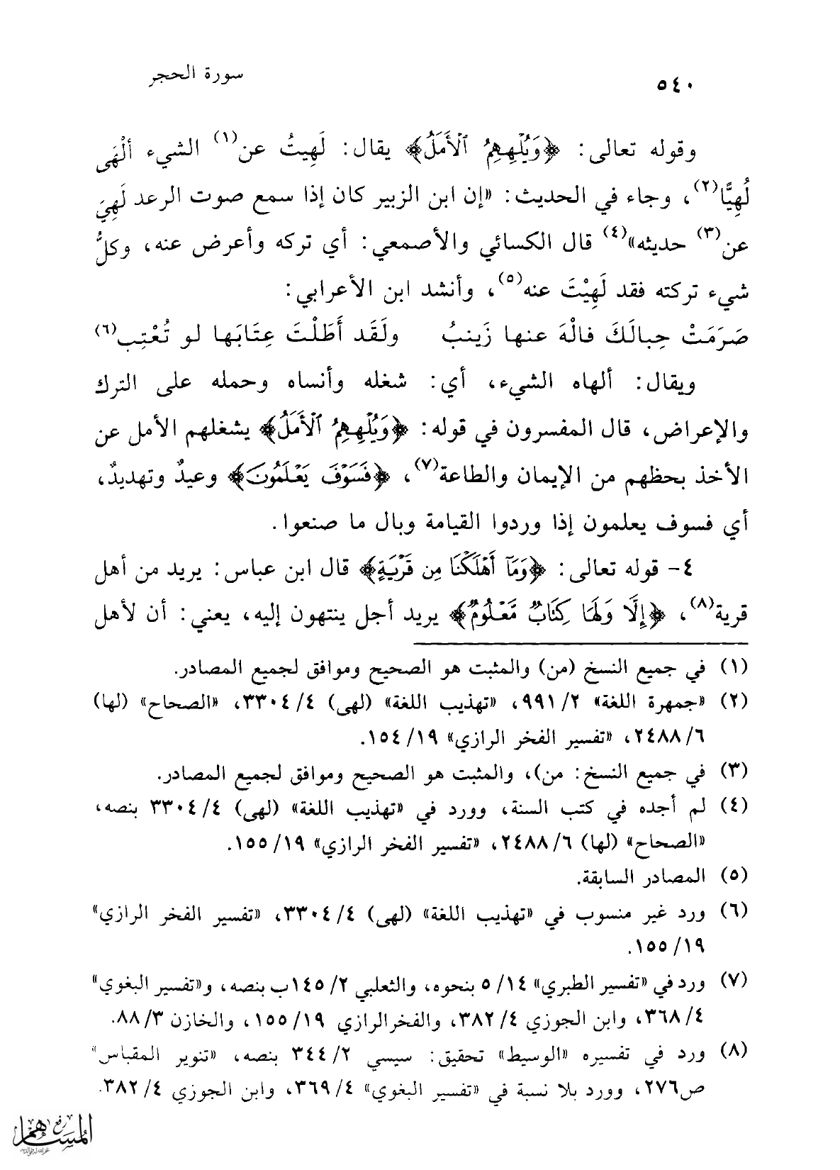 (¬2) "جمهرة اللغة" 2/ 991، "تهذيب اللغة" (لهى) 4/ 3304 "الصحاح" (لها) 6/ 2488، "تفسير الفخر الرازي" 19/ 154.