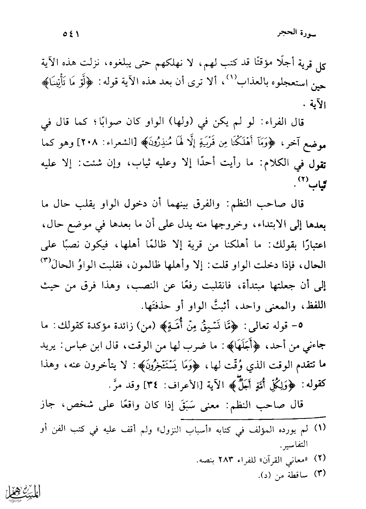 قال الفراء: لو لم يكن في (ولها) الواو كان صوابًا، كما قال في موضع آخر، {وَمَا أَهْلَكْنَا مِنْ قَرْيَةٍ إِلَّا لَهَا مُنْذِرُونَ} [الشعراء: 208] وهو كما تقول في الكلام: ما رأيت أحدًا إلا وعليه ثياب، وإن شئت: إلا عليه ثياب (¬2).