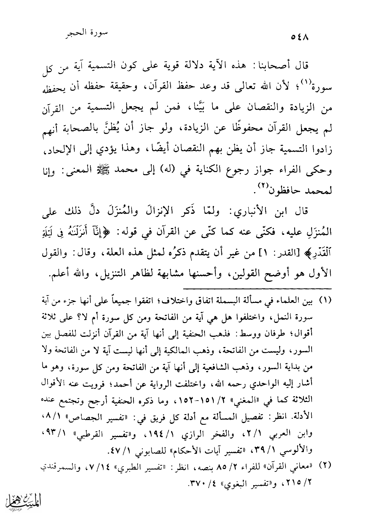 (¬1) بين العلماء في مسألة البسملة اتفاق واختلاف، اتفقوا جميعاً على أنها جزء من آية سورة النمل، واختلفوا هل هي آية من الفاتحة ومن كل سورة أم لا؟ على ثلاثة أقوال؛ طرفان ووسط: فذهب الحنفية إلى أنها آية من القرآن أنزلت للفصل بين السور، وليست من الفاتحة، وذهب المالكية إلى أنها ليست آية لا من الفاتحة ولا من بداية السور، وذهب الشافعية إلى أنها آية من الفاتحة ومن كل سورة، وهو ما أشار إليه الواحدي رحمه الله، واختلفت الرواية عن أحمد؛ فرويت عنه الأقوال الثلاثة كما في "المغني" 2/ 151 - 152، وما ذكره الحنفية أرجح وتجتمع عنده الأدلة. انظر: تفصيل المسألة مع أدلة كل فريق في: "تفسير الجصاص" 1/ 8، وابن العربي 1/ 2، والفخر الرازي 1/ 194، و"تفسير القرطبي" 1/ 93، والألوسي 1/ 39، "تفسير آيات الأحكام" للصابوني 1/ 47.