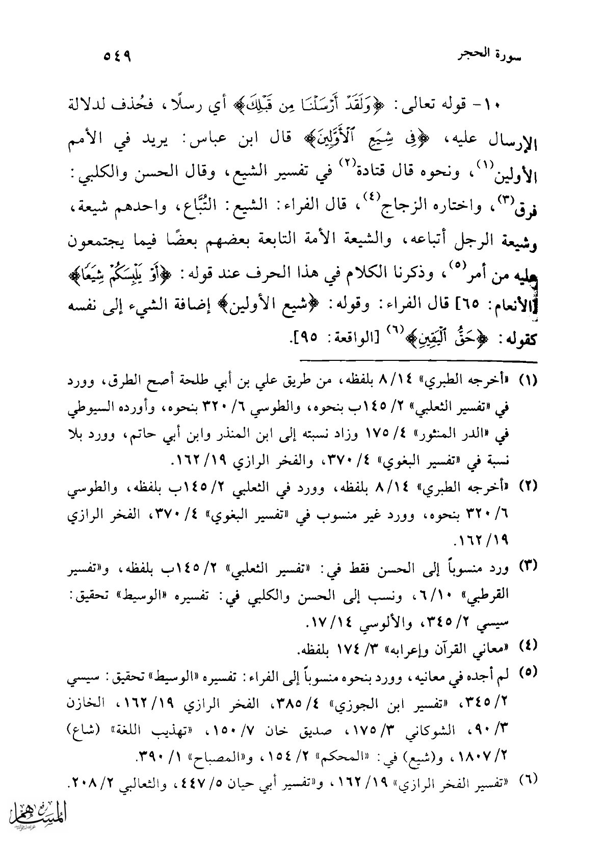 10 - قوله تعالى: {وَلَقَدْ أَرْسَلْنَا مِنْ قَبْلِكَ} أي رسلاً، فحُذف لدلالة الإرسال عليه، {فِي شِيَعِ الْأَوَّلِينَ} قال ابن عباس: يريد في الأمم الأولين (¬1)، ونحوه قال قتادة (¬2) في تفسير الشيع، وقال الحسن والكلبي: فرق (¬3)، واختاره الزجاج (¬4)، قال الفراء: الشيع: التُبَّاع، واحدهم شيعة، وشيعة الرجل أتباعه، والشيعة الأمة التابعة بعضهم بعضًا فيما يجتمعون عليه من أمر (¬5)، وذكرنا الكلام هذ الحرف عند قوله: {أَوْ يَلْبِسَكُمْ شِيَعًا} [الأنعام: 65] قال الفراء: وقوله: {شِيَعِ الْأَوَّلِينَ} إضافة الشيء إلى نفسه كقوله: {حَقُّ الْيَقِينِ} (¬6) [الواقعة: 95].