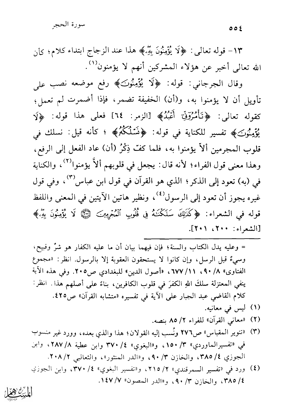 وقال الجرجاني: قوله: {لَا يُؤْمِنُونَ} رفع موضعه نصب علي تأويل أن لا يؤمنوا به، و (أن) الخفيفة تضمر، فإذا أضمرت لم تعمل؛ كقوله تعالى: {تَأْمُرُونِّي أَعْبُدُ} [الزمر: 64] فعلى هذا قوله: {لَا يُؤْمِنُونَ} تفسير للكناية في قوله: {نَسْلُكُهُ}؛ كأنه قيل: نسلك في قلوب المجرمين ألاّ يؤمنوا به، فلما كفّ ذِكْرُ (أن) عاد الفعل إلى الرفع، وهذا معنى قول الفراء؛ لأنه قال: يجعل في قلوبهم ألاَّ يؤمنوا (¬2)، والكناية في (به) تعود إلى الذكر؛ الذي هو القرآن في قول ابن عباس (¬3)، وفي قول غيره يجوز أن تعود إلى الرسول (¬4)، ونظير هاتين الآيتين في المعنى واللفظ قوله في الشعراء: {كَذَلِكَ سَلَكْنَاهُ فِي قُلُوبِ الْمُجْرِمِينَ (200) لَا يُؤْمِنُونَ بِهِ} [الشعراء: 200، 201].