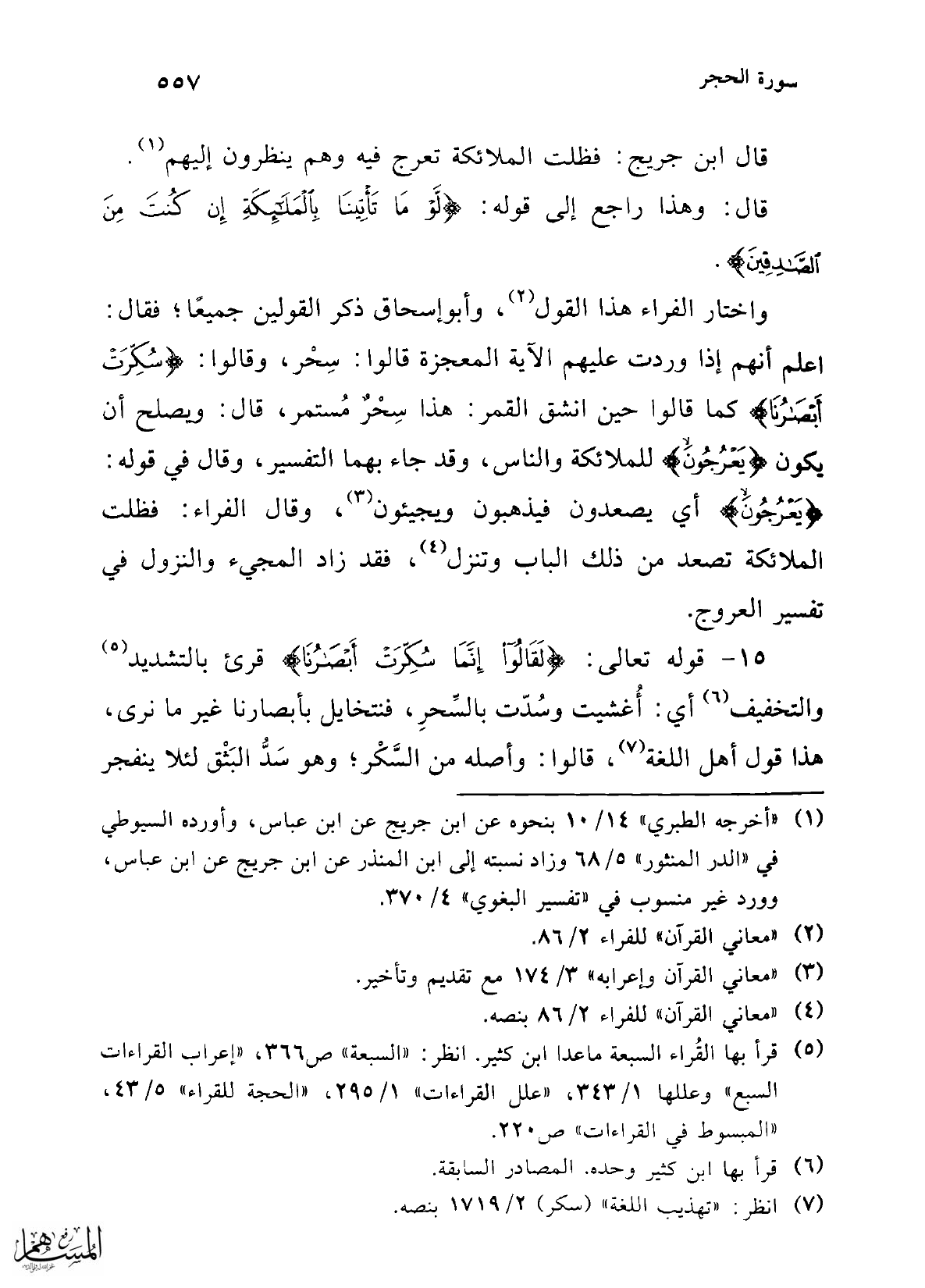 15 - قوله تعالى: {لَقَالُوا إِنَّمَا سُكِّرَتْ أَبْصَارُنَا} قرئ بالتشديد (¬5) والتخفيف (¬6) أي: أُغشيت وسُدّت بالسِّحرِ، فنتخايل بأبصارنا غير ما نرى، هذا قول أهل اللغة (¬7)، قالوا: وأصله من السَّكْر؛ وهو سَدُّ البَثْق لئلا ينفجر