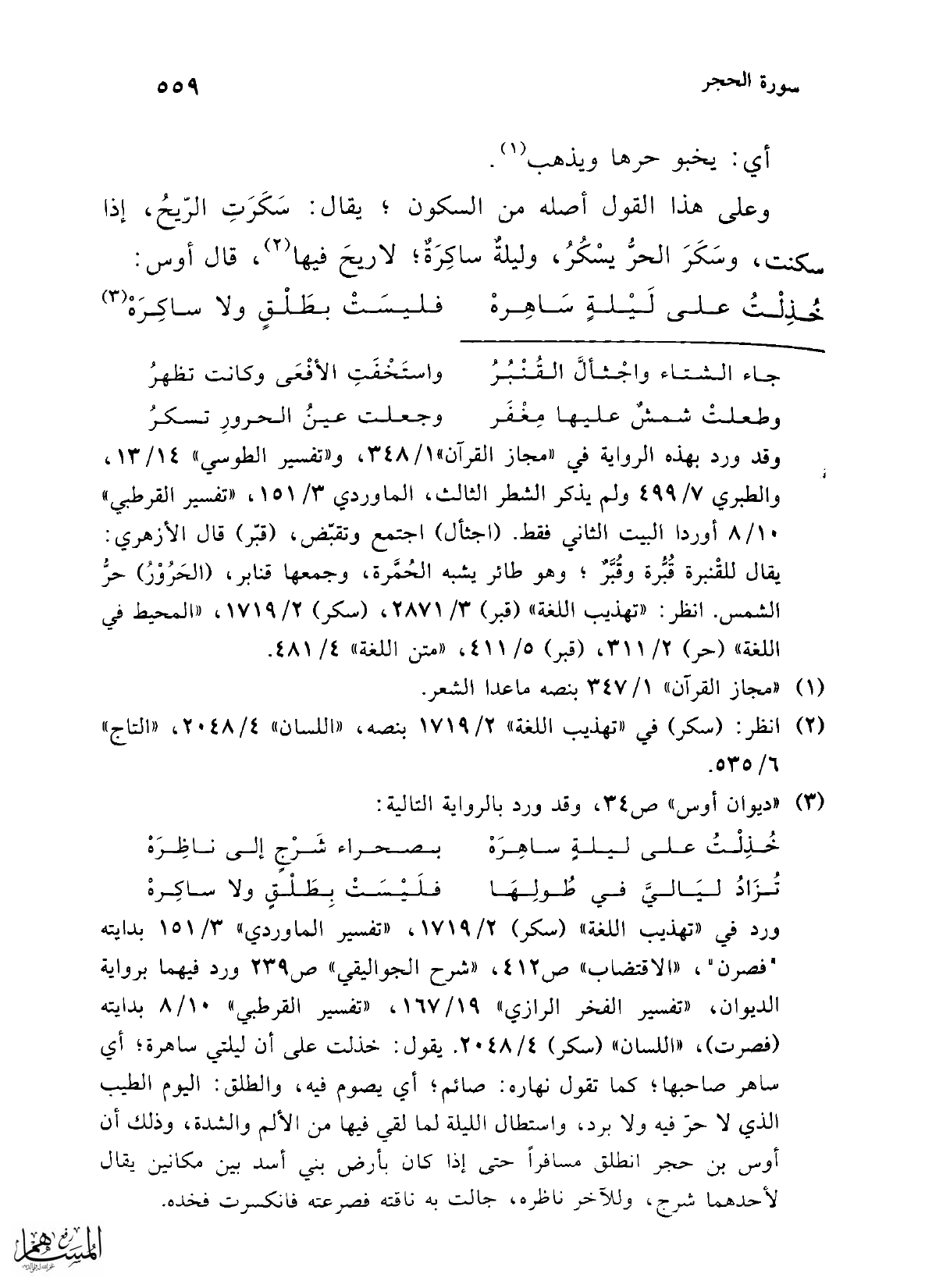 وقد ورد بهذه الرواية في "مجاز القرآن" 1/ 348، و"تفسير الطوسي" 14/ 13، والطبري 7/ 499 ولم يذكر الشطر الثالث، الماوردي 3/ 151، "تفسير القرطبي" 10/ 8 أوردا البيت الثاني فقط. (اجثأل) اجتمع وتقبّض، (قبّر) قال الأزهري: يقال للقْبرة قُبُّرة وقُبَّرٌ؛ وهو طائر يشبه الحُمَّرة، وجمعها قنابر، (الحَرُوْرُ) حرُّ الشمس. انظر: "تهذيب اللغة" (قبر) 3/ 2871، (سكر) 2/ 1719، "المحيط في اللغة" (حر) 2/ 311، (قبر) 5/ 411، "متن اللغة" 4/ 481.