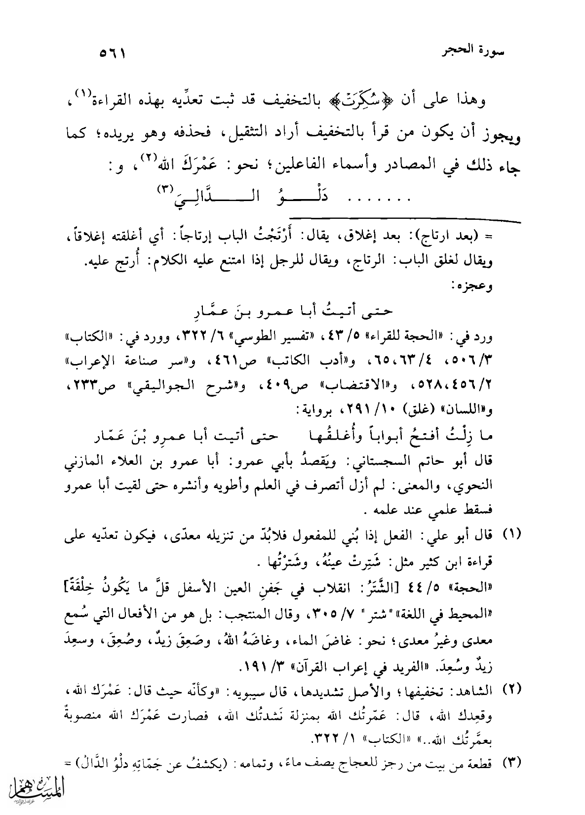 (¬2) الشاهد: تخفيفها؛ والأصل تشديدها، قال سيبويه: "وكأنّه حيث قال: عَمْرَك الله، وقعِدك الله، قال: عَمّرتُك الله بمنزلة نَشدتُك الله، فصارت عَمْرَك الله منصوبةً بعمَّرتُك الله .. " "الكتاب" 1/ 322.