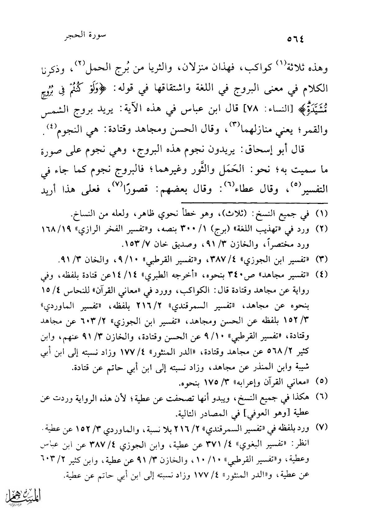وهذه ثلاثة (¬1) كواكب، فهذان منزلان، والثريا من بُرج الحمل (¬2)، وذكرنا الكلام في معنى البروج في اللغة واشتقاقها في قوله: {وَلَوْ كُنْتُمْ فِي بُرُوجٍ مُشَيَّدَةٍ} [النساء: 78]، قال ابن عباس في هذه الآية: يريد بروج الشمس والقمر؛ يعني منازلهما (¬3)، وقال الحسن ومجاهد وقتادة: هي النجوم (¬4).