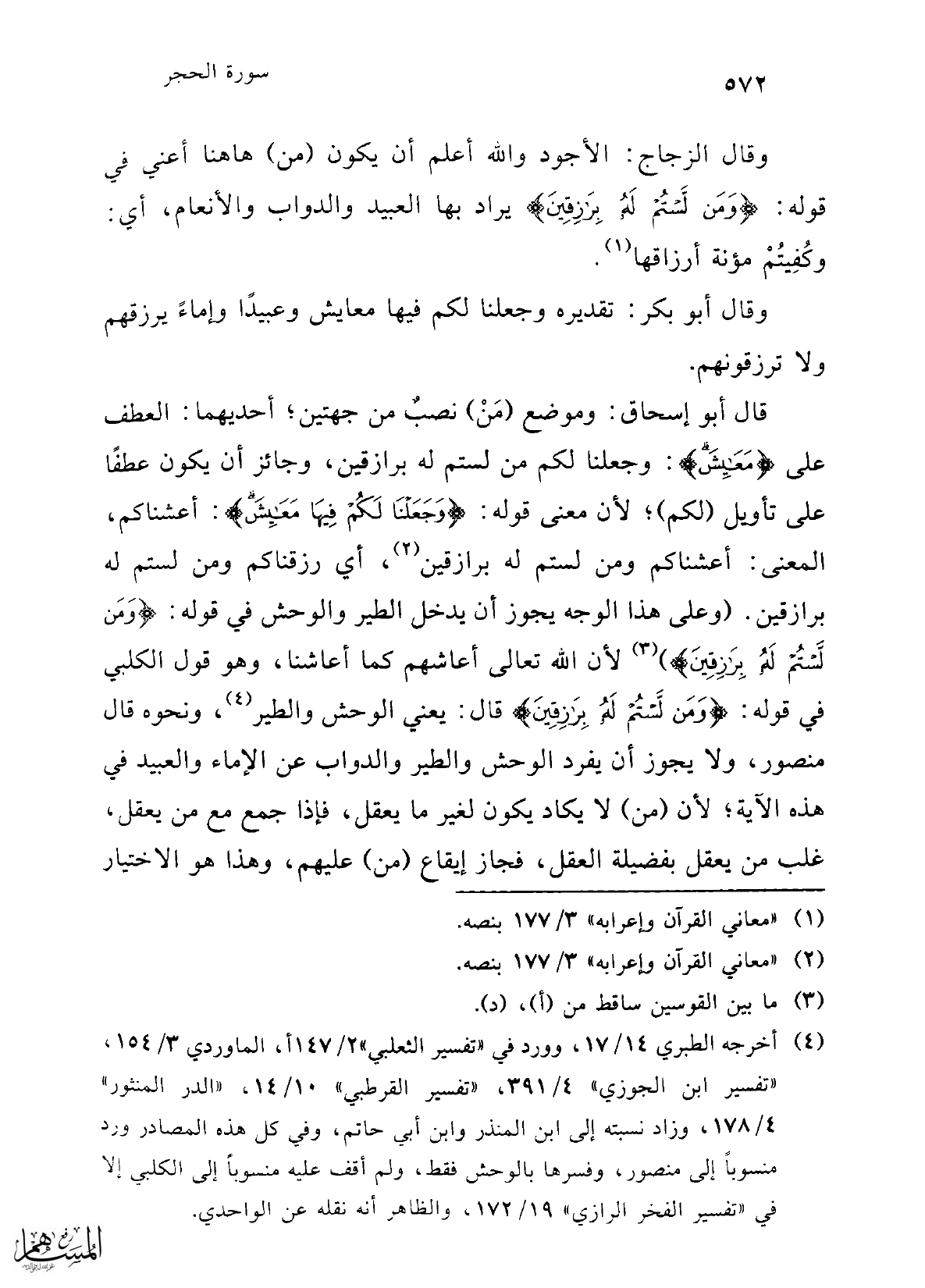 قال أبو إسحاق: وموضع (مَنْ) نصبٌ من جهتين؛ أحديهما: العطف على {مَعَايِشَ}: وجعلنا لكم من لستم له برازقين، وجائز أن يكون عطفًا على تأويل (لكم)؛ لأن معنى قوله: {وَجَعَلْنَا لَكُمْ فِيهَا مَعَايِشَ}: أعشناكم، المعنى: أعشناكم ومن لستم له برازقين (¬2)، أي رزقناكم ومن لستم له برازقين. (وعلى هذا الوجه يجوز أن يدخل الطير والوحش في قوله: {وَمَنْ لَسْتُمْ لَهُ بِرَازِقِينَ} (¬3) لأن الله تعالى أعاشهم كما أعاشنا، وهو قول الكلبي في قوله: {وَمَنْ لَسْتُمْ لَهُ بِرَازِقِينَ} قال: يعني الوحش والطير (¬4)، ونحوه قال منصور، ولا يجوز أن يفرد الوحش والطير والدواب عن الإماء والعبيد في هذه الآية؛ لأن (من) لا يكاد يكون لغير ما يعقل، فإذا جمع مع من يعقل، غلب من يعقل بفضيلة العقل، فجاز إيقاع (من) عليهم، وهذا هو الاختيار