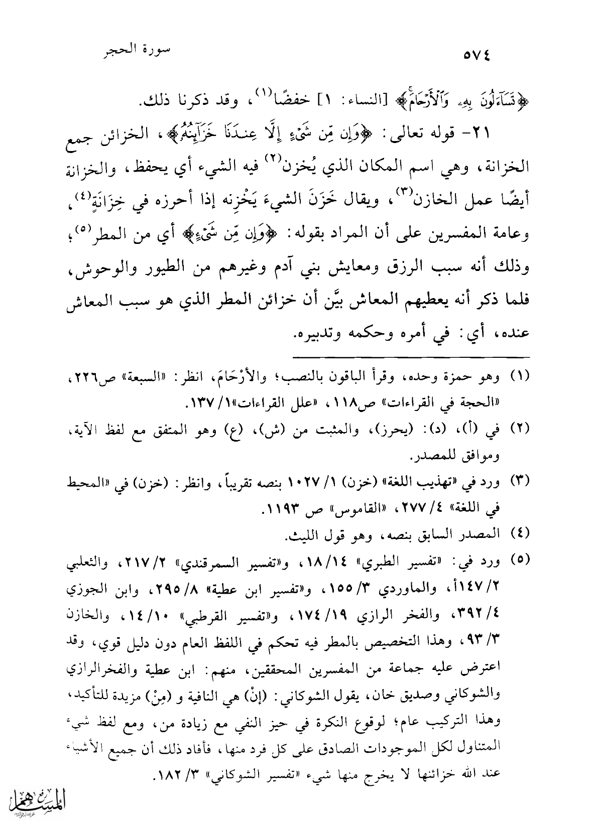(¬5) ورد في: "تفسير الطبري" 14/ 18، و"تفسير السمرقندي" 2/ 217، والثعلبي 2/ 147 أ، والماوردي 3/ 155، و"تفسير ابن عطية" 8/ 295، وابن الجوزي 4/ 392، والفخر الرازي 19/ 174، و"تفسير القرطبي" 10/ 14، والخازن 3/ 93، وهذا التخصيص بالمطر فيه تحكم في اللفظ العام دون دليل قوي، وقد اعترض عليه جماعة من المفسرين المحققين، منهم: ابن عطية والفخر الرازي والشوكاني وصديق خان، يقول الشوكاني: (إنْ) هي النافية و (مِنْ) مزيدة للتأكيد، وهذا التركيب عام؛ لوقوع النكرة في حيز النفي مع زيادة من، ومع لفظ شيء المتناول لكل الموجودات الصادق على كل فرد منها، فأفاد ذلك أن جميع الأشياء عند الله خزائنها لا يخرج منها شيء "تفسير الشوكاني" 3/ 182.
