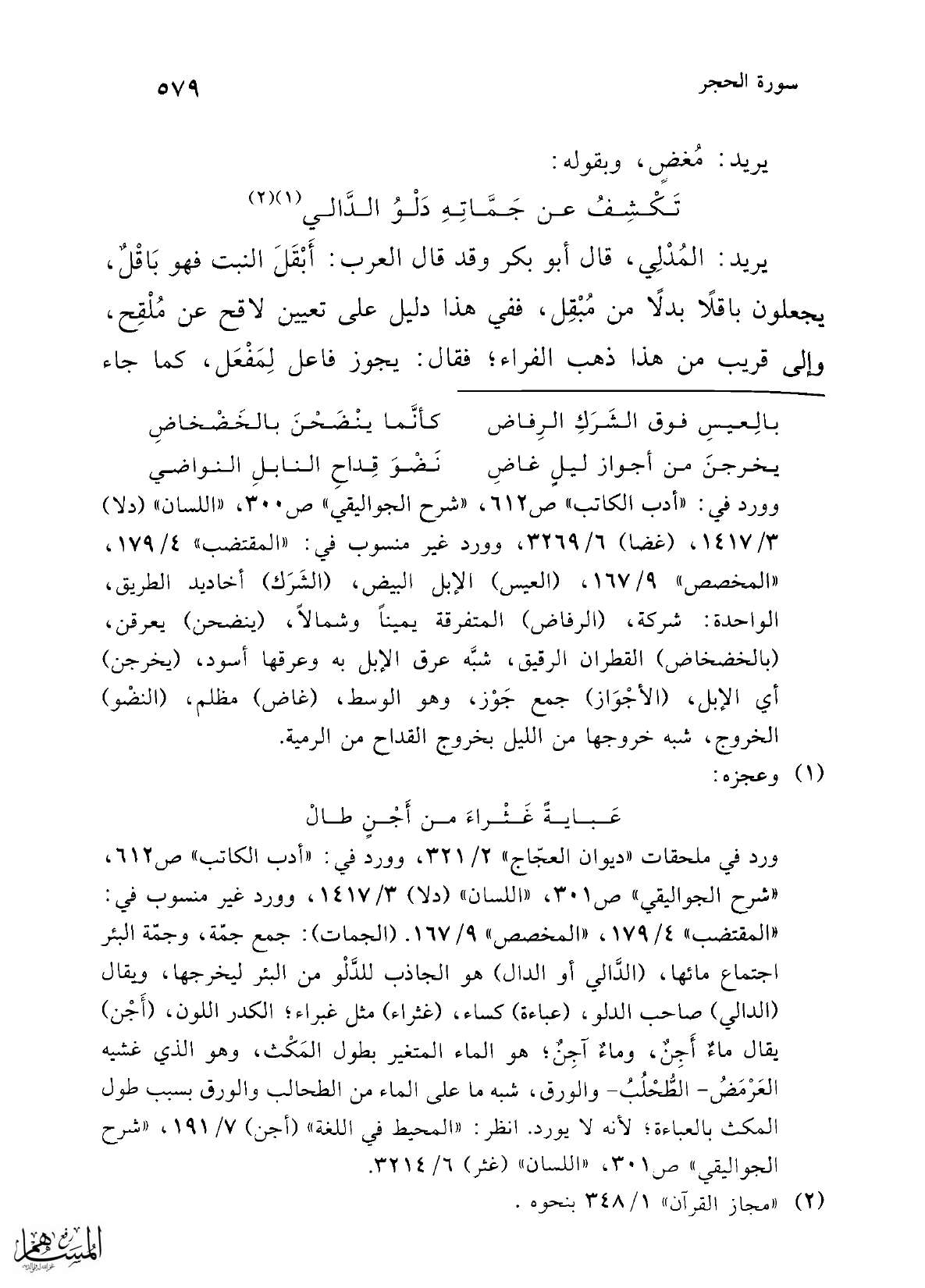 ورد في ملحقات "ديوان العجّاج" 2/ 321، وورد في: "أدب الكاتب" ص 612، "شرح الجواليق" ص301، "اللسان" (دلا) 3/ 1417، وورد غير منسوب في: "المقتضب" 4/ 179، "المخصص" 9/ 167. (الجمات): جمع جمّة، وجمّة البئر اجتماع مائها، (الدَّالي أو الدال) هو الجاذب للدَّلْو من البئر ليخرجها، ويقال (الدالي) صاحب الدلو، (عباءة) كساء، (غثراء) مثل غبراء؛ الكدر اللون، (أَجْن) يقال ماءٌ أَجِنٌ، وماءٌ آجِنٌ؛ هو الماء المتغير بطول المَكْث، وهو الذي غشيه العَرْمَضُ -الطُّحْلُبُ- والورق، شبه ما على الماء من الطحالب والورق بسبب طول المكث بالعباءة؛ لأنه لا يورد. انظر: "المحيط في اللغة" (أجن) 7/ 191، "شرح الجواليقي" ص 301، "اللسان" (غثر) 6/ 3214.