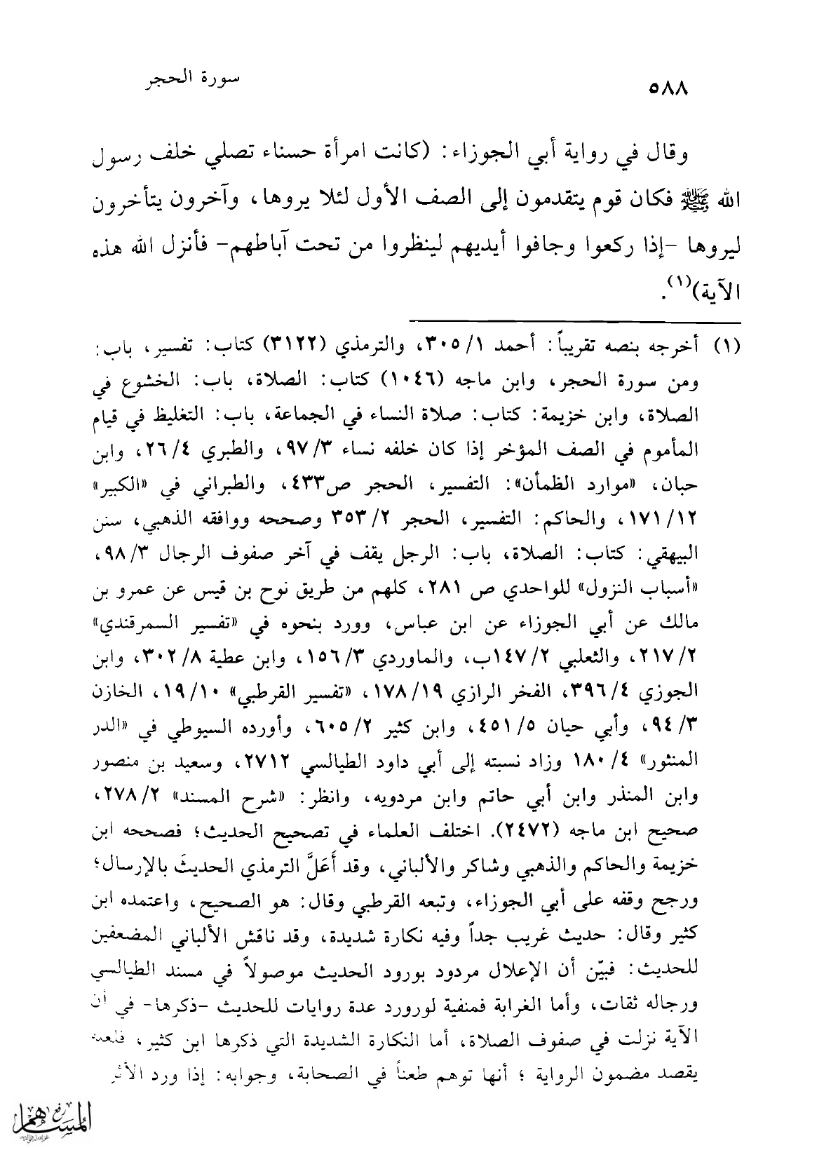 (¬1) أخرجه بنصه تقريبًا: أحمد 1/ 305، والترمذي (3122) كتاب: تفسير، باب. ومن سورة الحجر، وابن ماجه (1046) كتاب: الصلاة، باب: الخشوع في الصلاة، وابن خزيمة: كتاب: صلاة النساء في الجماعة، باب: التغليظ في قيام المأموم في الصف المؤخر إذا كان خلفه نساء 3/ 97، والطبري 4/ 26، وابن حبان، "موارد الظمأن": التفسير، الحجر ص 433، والطبراني في "الكبير" 12/ 171، والحاكم: التفسير، الحجر 2/ 353 وصححه ووافقه الذهبي، سنن البيهقي: كتاب: الصلاة، باب: الرجل يقف في آخر صفوف الرجال 3/ 98، "أسباب النزول" للواحدي ص 281، كلهم من طريق نوح بن قيس عن عمرو بن مالك عن أبي الجوزاء عن ابن عباس، وورد بنحوه في "تفسير السمرقندي" 2/ 217، والثعلبي 2/ 147 ب، والماوردي 3/ 156، وابن عطية 8/ 302، وابن الجوزي 4/ 396، الفخر الرازي 19/ 178، "تفسير القرطبي" 10/ 19، الخازن 3/ 94، وأبي حيان 5/ 451، وابن كثير 2/ 605، وأورده السيوطي في "الدر المنثور" 4/ 180 وزاد نسبته إلى أبي داود الطيالسي 2712، وسعيد بن منصور وابن المنذر وابن أبي حاتم وابن مردويه، وانظر: "شرح المسند" 2/ 278، صحيح ابن ماجه (2472). اختلف العلماء في تصحيح الحديث، فصححه ابن خزيمة والحاكم والذهبي وشاكر والألباني، وقد أَعَلَّ الترمذي الحديثَ بالإرسال؛ ورجح وقفه على أبي الجوزاء، وتبعه القرطبي وقال: هو الصحيح، واعتمده ابن كثير وقال: حديث غريب جداً وفيه نكارة شديدة، وقد ناقش الألباني المضعفين للحديث: فبيّن أن الإعلال مردود بورود الحديث موصولاً في مسند الطيالسي ورجاله ثقات، وأما الغرابة فمنفية لورورد عدة روايات للحديث -ذكرها- في أن الآية نزلت في صفوف الصلاة، أما النكارة الشديدة التي ذكرها ابن كثير، فلعه يقصد مضمون الرواية؛ أنها توهم طعنًا في الصحابة، وجوابه: إذا ورد الأثر =