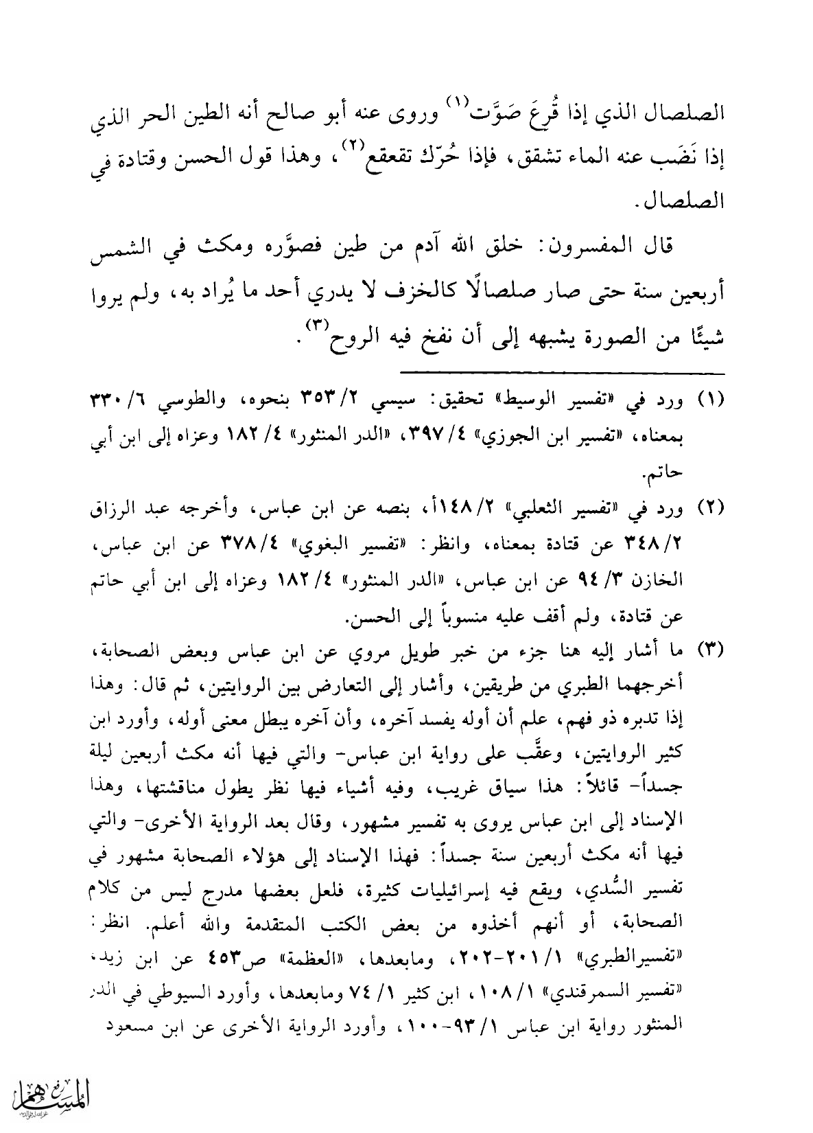 (¬3) ما أشار إليه هنا جزء من خبر طويل مروي عن ابن عباس وبعض الصحابة، أخرجهما الطبري من طريقين، وأشار إلى التعارض بين الروايتين، ثم قال: وهذا إذا تدبره ذو فهم، علم أن أوله يفسد آخره، وأن آخره يبطل معنى أوله، وأورد ابن كثير الروايتين، وعقَّب على رواية ابن عباس -والتي فيها أنه مكث أربعين ليلة جسداً- قائلاً: هذا سياق غريب، وفيه أشياء فيها نظر يطول مناقشتها، وهذا الإسناد إلى ابن عباس يروى به تفسير مشهور، وقال بعد الرواية الأخرى - والتي فيها أنه مكث أربعين سنة جسداً: فهذا الإسناد إلى هؤلاء الصحابة مشهور في تفسير السُّدي، ويقع فيه إسرائيليات كثيرة، فلعل بعضها مدرج ليس من كلام الصحابة، أو أنهم أخذوه من بعض الكتب المتقدمة والله أعلم. انظر: "تفسير الطبري" 1/ 201 - 202، وما بعدها، "العظمة" ص 453 عن ابن زيد، "تفسير السمرقندي" 1/ 108، ابن كثير 1/ 74 وما بعدها، وأورد السوطي في الدر المنثور رواية ابن عباس 1/ 93 - 100، وأورد الرواية الأخرى عن ابن مسعود =
