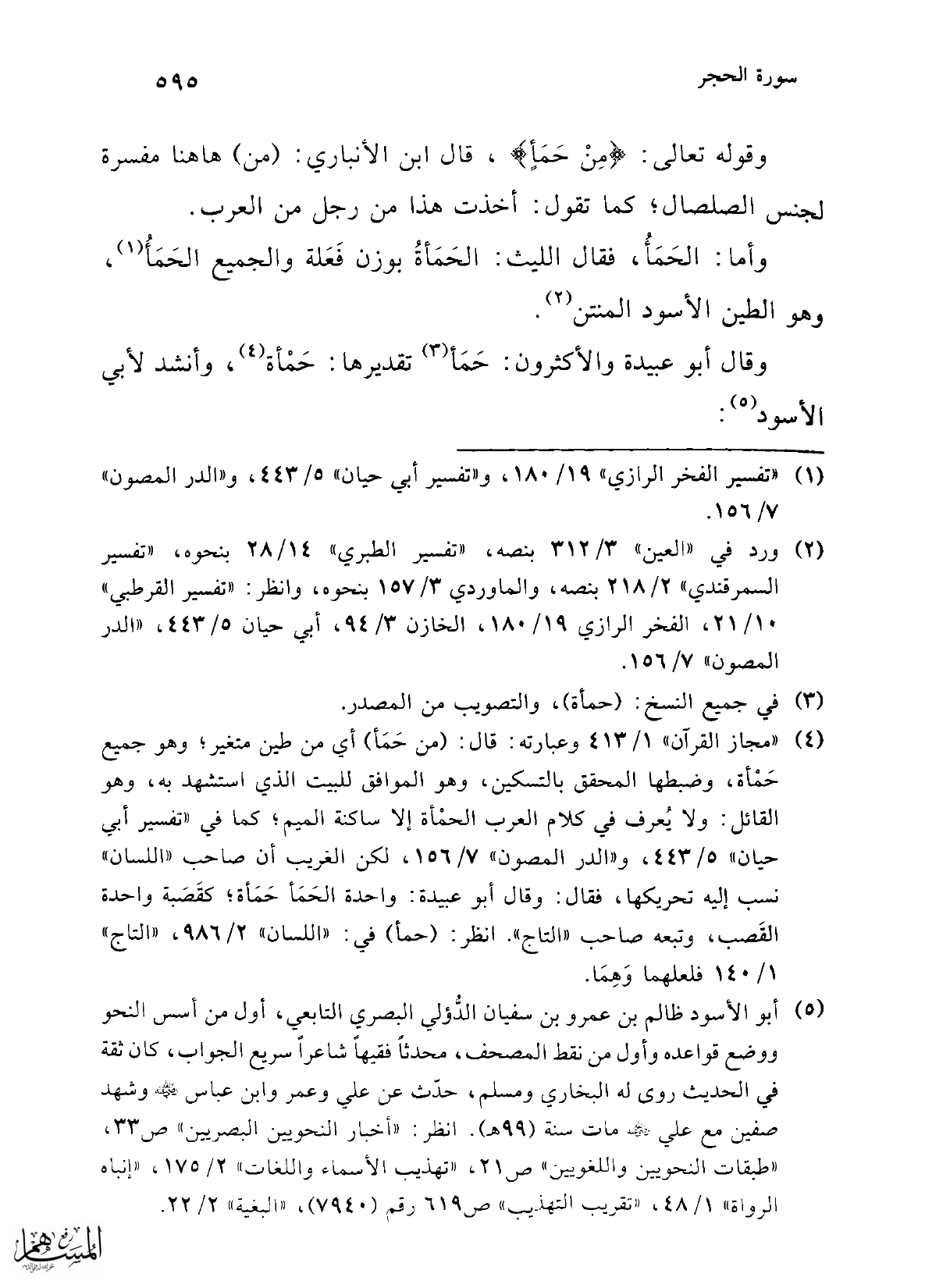 (¬4) "مجاز القرآن" 1/ 413 وعبارته: قال: (من حَمَأ) أي من طين متغير؛ وهو جميع حَمْأة، وضبطها المحقق بالتسكين، وهو الموافق للبيت الذي استشهد به، وهو القائل: ولا يُعرف في كلام العرب الحمْأة إلا ساكنة الميم؛ كما في "تفسير أبي حيان" 5/ 443، و"الدر المصون" 7/ 156، لكن العريب أن صاحب "اللسان" نسب إليه تحريكها، فقال: وقال أبو عبيدة: واحدة الحَمَأ حَمَأة؛ كقَصَبة واحدة القَصب، وتبعه صاحب "التاج". انظر: (حمأ) في: "اللسان" 2/ 986، "التاج" 1/ 140 فلعلهما وَهِمَا.