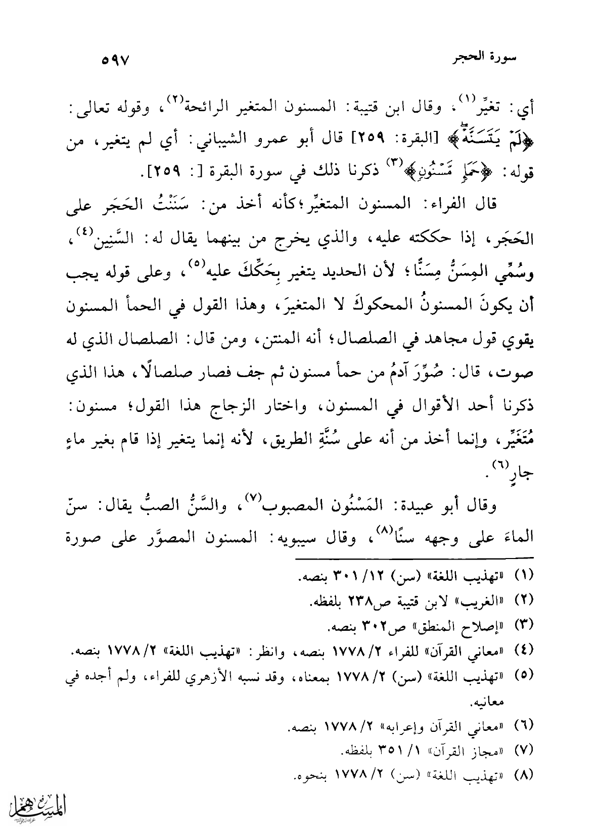 أي: تغيِّر (¬1)، وقال ابن قتيبة: المسنون المتغير الرائحة (¬2)، وقوله تعالى: {لَمْ يَتَسَنَّهْ} [البقرة: 259] قال أبو عمرو الشيباني: أي لم يتغير، من وقوله: {حَمَإٍ مَسْنُونٍ} (¬3) ذكرنا ذلك في سورة البقرة [: 259].