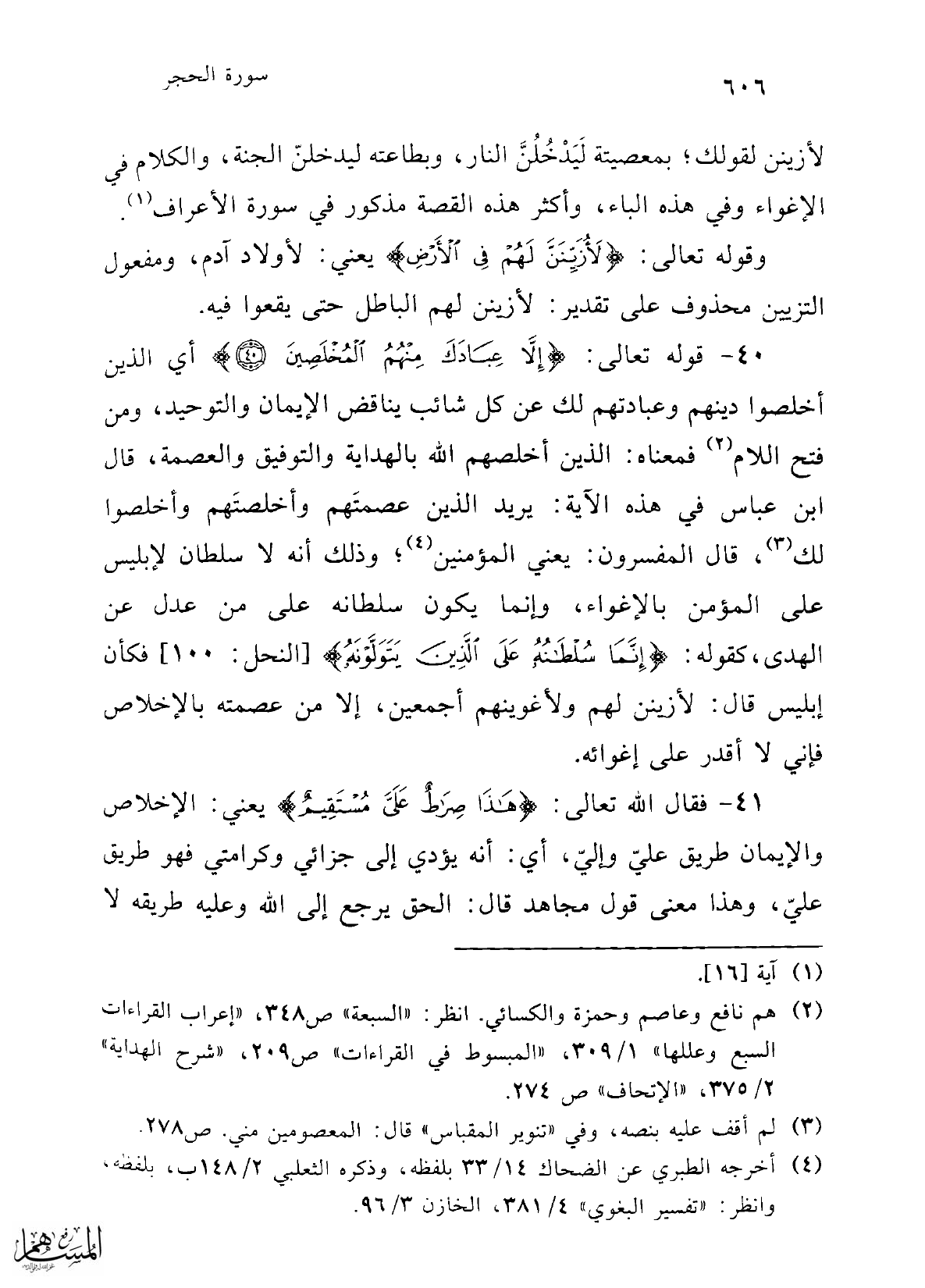 40 - قوله تعالى: {إِلَّا عِبَادَكَ مِنْهُمُ الْمُخْلَصِينَ (40)} أي الذين أخلصوا دينهم وعبادتهم لك عن كل شائب يناقض الإيمان والتوحيد، ومن فتح اللام (¬2) فمعناه: الذين أخلصهم الله بالهداية والتوفيق والعصمة، قال ابن عباس في هذه الآية: يريد الذين عصمتَهم وأخلصتَهم وأخلصوا لك (¬3)، قال المفسرون: يعني المؤمنين (¬4)؛ وذلك أنه لا سلطان لإبليس على المؤمن بالإغواء، وإنما يكون سلطانه على من عدل عن الهدى، كقوله: {إِنَّمَا سُلْطَانُهُ عَلَى الَّذِينَ يَتَوَلَّوْنَهُ} [النحل: 100] فكأن إبليس قال: لأزشن لهم ولأغوينهم أجمعين، إلا من عصمته بالإخلاص فإني لا أقدر على إغوائه.