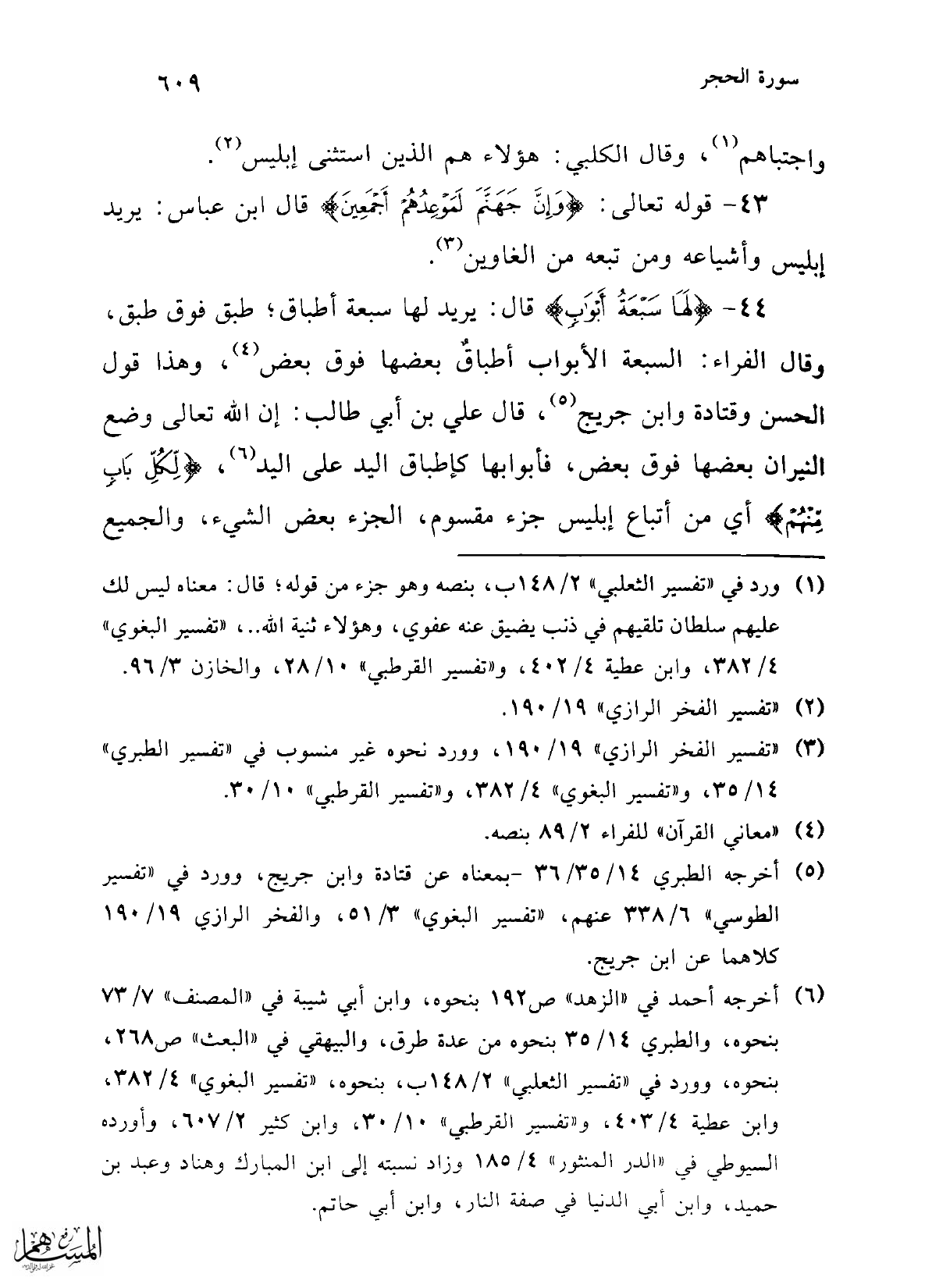 (¬1) ورد في "تفسير الثعلبي" 2/ 148 ب، بنصه وهو جزء من قوله؛ قال: معناه ليس لك عليهم سلطان تلقيهم في ذنب يضيق عنه عفوي، وهؤلاء ثنية الله .. ، "تفسير البغوي" 4/ 382، وابن عطية 4/ 402، و"تفسير القرطبي" 10/ 28، والخازن 3/ 96.