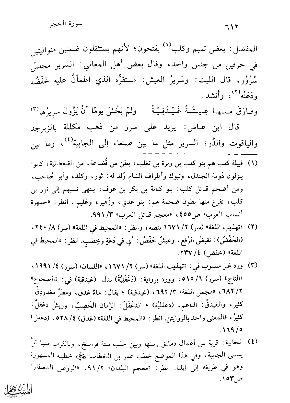 (¬1) قبيلة كلب هم بنو كلب بن وبرة بن تغلب، بطن من قُضاعة، من القحطانية، كانوا ينزلون دُومة الجندل، وتبوك وأطراف الشام وُلد له: ثور، وكلد، وأبو حُباحب، ومن أضخم قبائل كلب: بنو كنانة بن بكر بن عوف، ينتهي نسبهم إلى ثور بن كلب، تفرع منها بطون ضخمة هم: بنو عدي، وزُهير، وعُليم. انظر: "جمهرة أنساب العرب" ص 455، "معجم قبائل العرب" 3/ 991.
