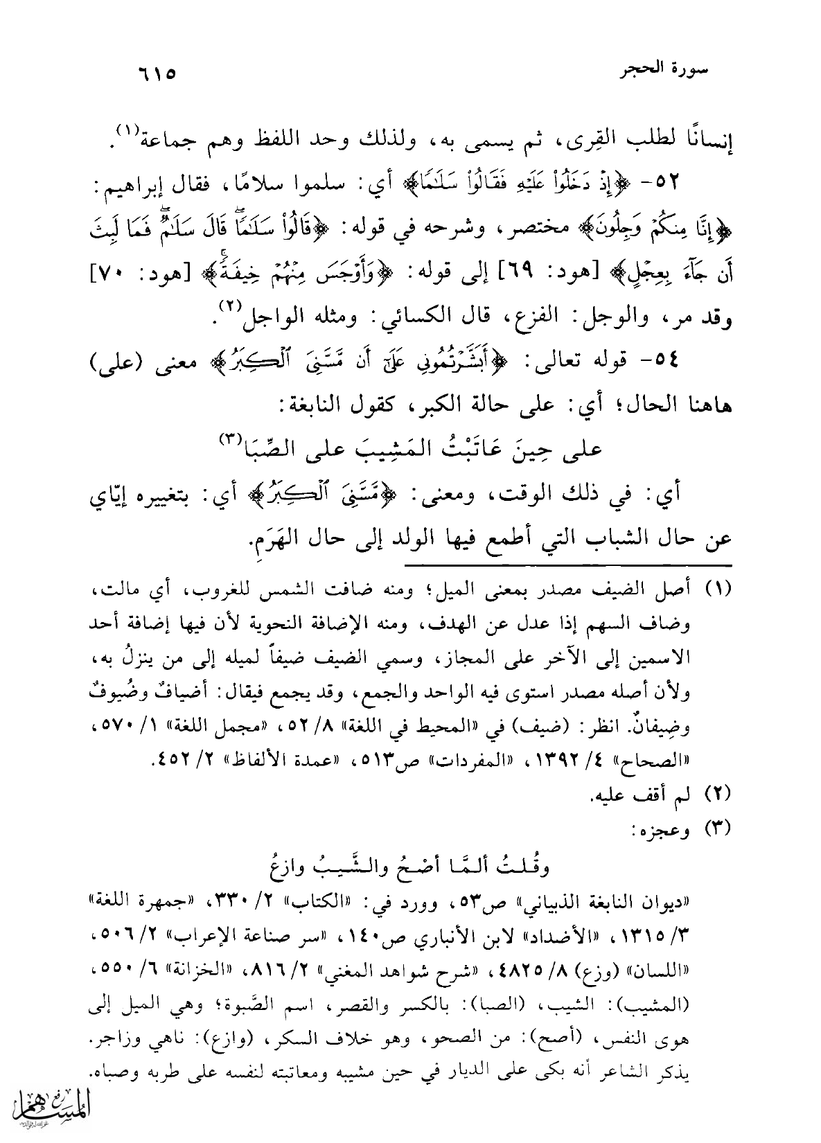 52 - {إِذْ دَخَلُوا عَلَيْهِ فَقَالُوا سَلَامًا} أي: سلموا سلامًا، فقال إبراهيم: {إِنَّا مِنْكُمْ وَجِلُونَ} مختصر، وشرحه في قوله: {قَالُوا سَلَامًا قَالَ سَلَامٌ فَمَا لَبِثَ أَنْ جَاءَ بِعِجْلٍ} [هود: 69] إلى قوله: {وَأَوْجَسَ مِنْهُمْ خِيفَةً} [هود: 70] وقد مر، والوجل: الفزع، قال الكسائي: ومثله الواجل (¬2).