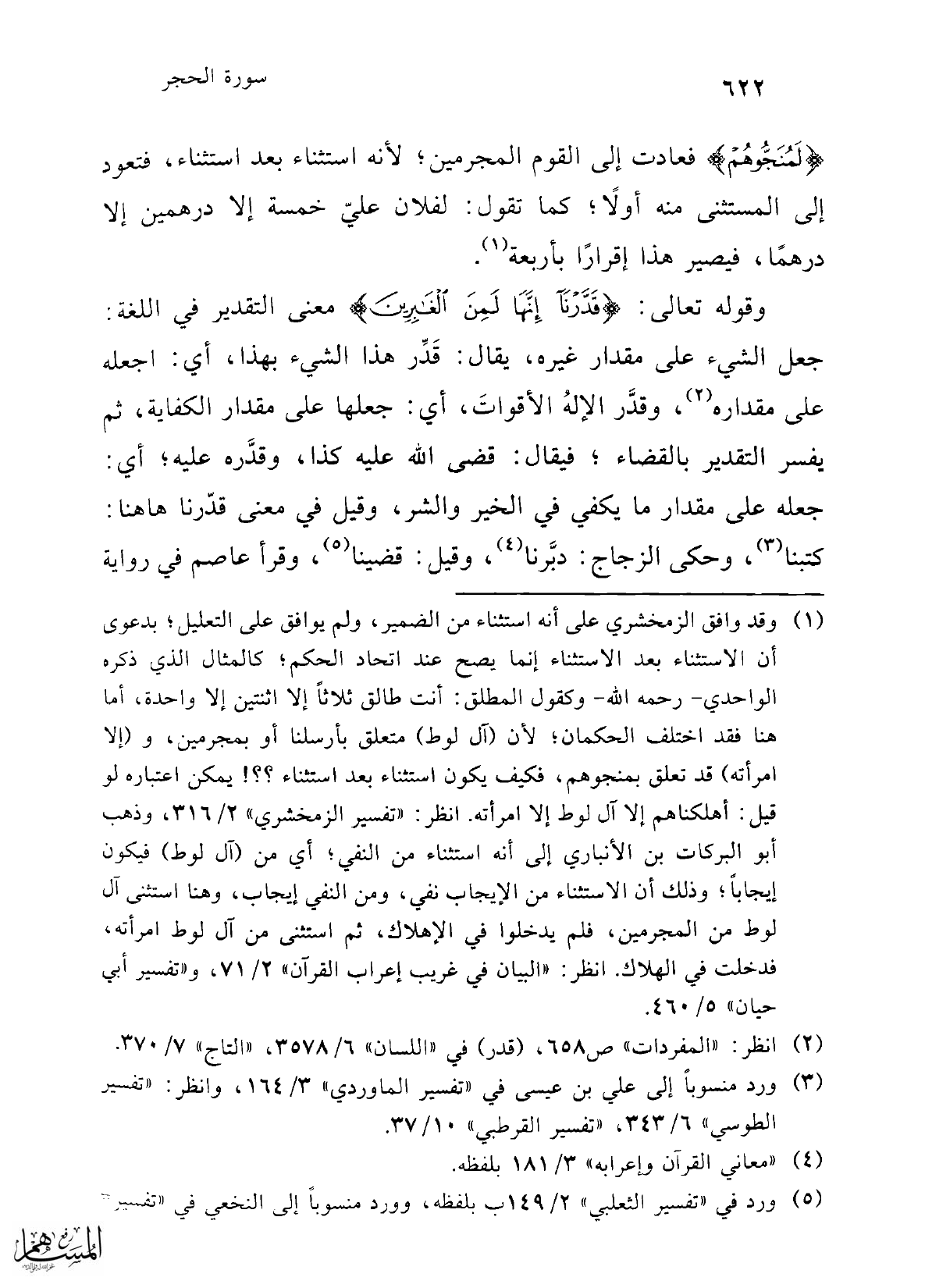 (¬1) وقد وافق الزمخشري على أنه استثناء من الضمير، ولم يوافق على التعليل؛ بدعوى أن الاستثناء بعد الاستثناء إنما يصح عند اتحاد الحكم؛ كالمثال الذي ذكره الواحدي -رحمه الله- وكقول المطلق: أنت طالق ثلاثاً إلا اثنتين إلا واحدة، أما هنا فقد اختلف الحكمان؛ لأن (آل لوط) متعلق بأرسلنا أو بمجرمين، و (إلا امرأته) قد تعلق بمنجوهم، فكيف يكون استثناء بعد استثناء؟؟! يمكن اعتباره لو قيل: أهلكناهم إلا آل لوط إلا امرأته. انظر: "تفسير الزمخشري" 2/ 316، وذهب أبو البركات بن الأنباري إلى أنه استثناء من النفي؛ أي من (آل لوط) فيكون إيجاباً؛ وذلك أن الاستثناء من الإيجاب نفي، ومن النفي إيجاب، وهنا استثنى آل لوط من المجرمين، فلم يدخلوا في الإهلاك، ثم استثنى من آل لوط امرأته؛ فدخلت في الهلاك. انظر: "البيان في غريب إعراب القرآن" 2/ 71، و"تفسير أبي حيان" 5/ 460.