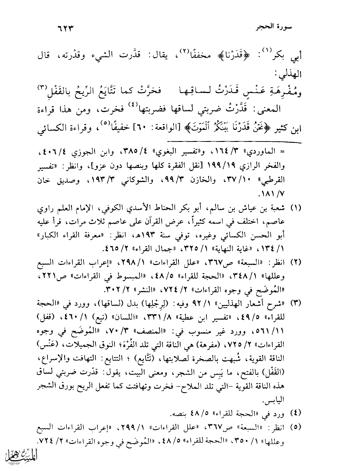 (¬5) انظر: "السبعة" ص 367، "علل القراءات" 1/ 299، "إعراب القراءات السبع وعللها" 1/ 350، "الحجة للقراء" 5/ 48، "المُوضَح في وجوه القراءات" 2/ 724.
