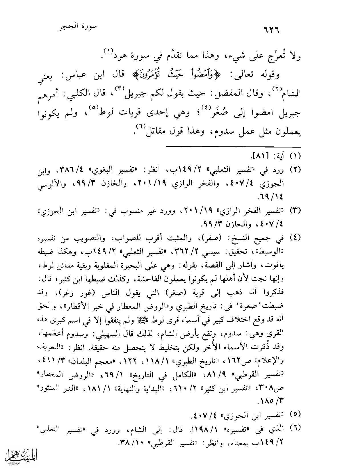 (¬4) في جميع النسخ: (صفر)، والمثبت أقرب للصواب، والتصويب من تفسيره "الوسيط"، تحقيق: سيسي 2/ 362، "تفسير الثعلبي" 2/ 149 ب، وهكذا ضبطه ياقوت، وأشار إلى القصة، بقوله: وهي على البحيرة المقلوبة وبقية مدائن لوط، وإنها نجت لأن أهلها لم يكونوا يعملون الفاحشة، وكذلك ضبطها ابن كثير؛ قال: فذكروا أنه ذهب إلى قرية (صغر) التي يقول الناس (غور زغر)، وقد ضبطت "صعرة". في: تاريخ الطبري و"الروض المعطار في خبر الأقطار"، والحق أنه قد وقع اختلاف كبير في أسماء قرى لوط -عليه السلام- ولم يتفقوا إلا في اسم كبرى هذه القرى وهي: سدوم، وتقع بأرض الشام، لذلك قال السهيلي: وسدوم أعظمها، وقد ذُكرت الأسماء الأُخر ولكن بتخليط لا يتحصل منه حقيقة. انظر: "التعريف والإعلام" ص 162، "تاريخ الطبري" 1/ 118، 122، "معجم البلدان" 3/ 411، "تفسير القرطبي" 9/ 81، "الكامل في التاريخ" 1/ 69، "الروض المعطار" ص 308، "تفسير ابن كثير" 2/ 610، "البداية والنهاية" 1/ 181، "الدر المنثور" 3/ 185.