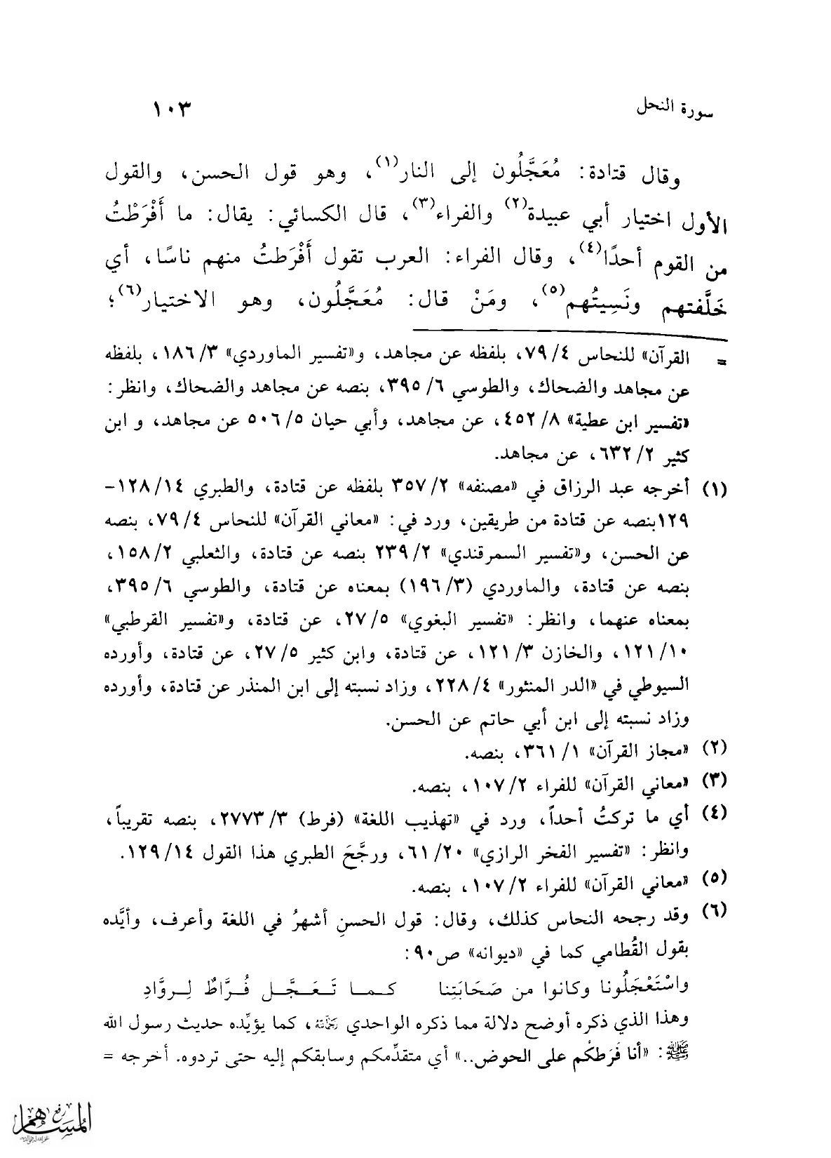 وهذا الذي ذكره أوضح دلالة مما ذكره الواحدي رحمه الله، كما يؤيِّده حديث رسول الله -صلى الله عليه وسلم-:"أنا فَرَطكْم على الحوض .. " أي متقدِّمكم وسابقكم إليه حتى تردوه. أخرجه البخاري (6575): الرقاق، في الحوض، ومسلم (2289) كتاب: الفضائل، باب: إثبات حوض نبينا -صلى الله عليه وسلم- وصفاته، وقد جمع ابن كثير بين القولين -في (مفرطون) - وقال: ولا منافاة؛ [أي بينهما]، لأنهم يعجل بهم يوم القيامة إلى النار وينسون فيها؛ أي يخلدون. "تفسير ابن كثير" 2/ 595.