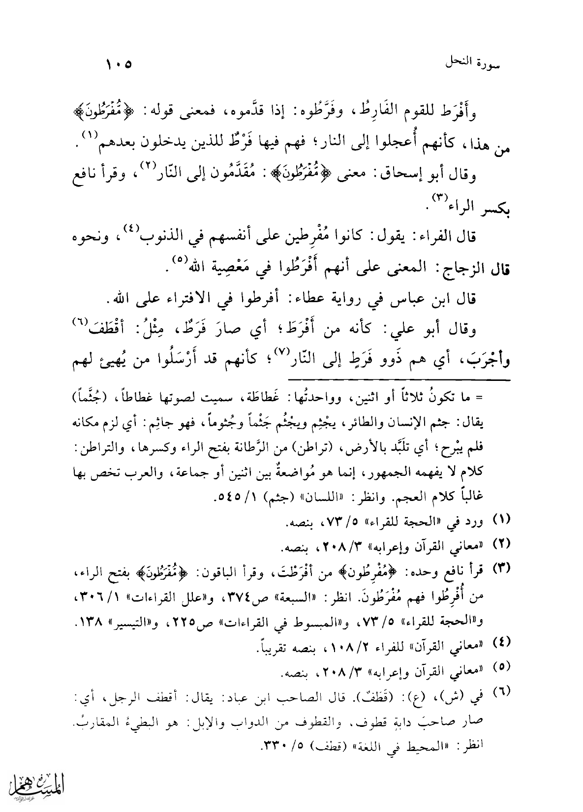 وقال أبو علي: كأنه من أَفْرَطَ؛ أي صارَ فَرَطٌ، مِثْلُ: أقْطَفَ (¬6) وأجْرَبَ، أي هم ذَوو فَرَطٍ إلى النّار (¬7)؛كأنهم قد أَرْسَلُوا من يُهيئ لهم