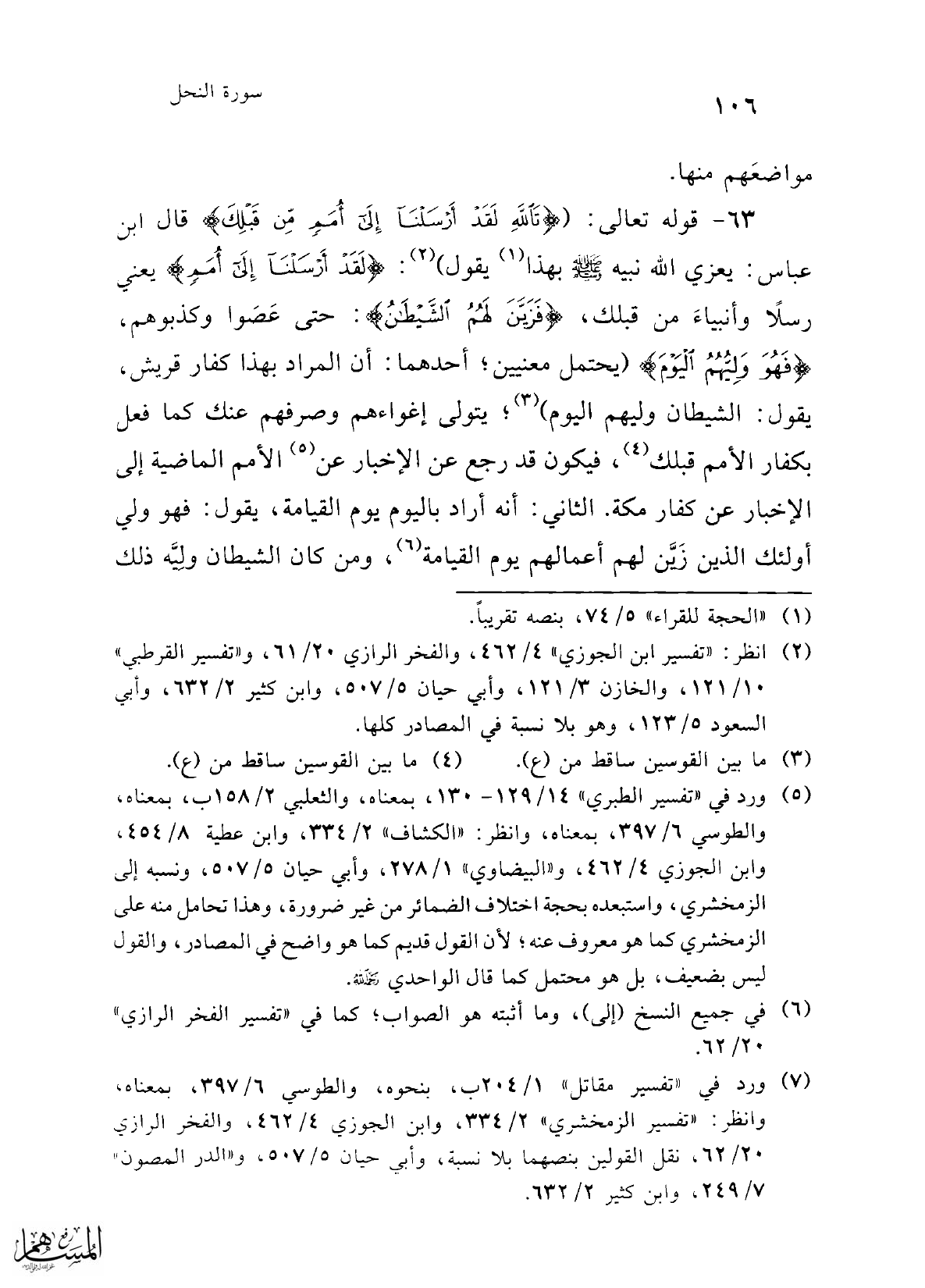 63 - قوله تعالى: ({تَاللَّهِ لَقَدْ أَرْسَلْنَا إِلَى أُمَمٍ مِنْ قَبْلِكَ} قال ابن عباس: يعزي الله نبيه -صلى الله عليه وسلم- بهذا (¬1) يقول) (¬2): {لَقَدْ أَرْسَلْنَا إِلَى أُمَمٍ} يعني رسلًا وأنبياءَ من قبلك، {فَزَيَّنَ لَهُمُ الشَّيْطَانُ}: حتى عَصَوا وكذبوهم، {فَهُوَ وَلِيُّهُمُ الْيَوْمَ} (يحتمل معنيين؛ أحدهما: أن المراد بهذا كفار قريش، يقول: الشيطان وليهم اليوم) (¬3)؛ يتولى إغواءهم وصرفهم عنك كما فعل بكفار الأمم قبلك (¬4)، فيكون قد رجع عن الإخبار عن (¬5) الأمم الماضية إلى الإخبار عن كفار مكة. الثاني: أنه أراد باليوم يوم القيامة، يقول: فهو ولي أولئك الذين زَيَّن لهم أعمالهم يوم القيامة (¬6)، ومن كان الشيطان ولِيَّه ذلك