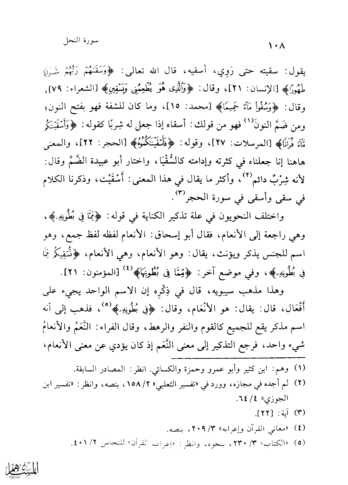 واختلف النحويون في علة تذكير الكناية في قوله: {مِمَّا فِي بُطُونِهِ}، وهي راجعة إلى الأنعام، فقال أبو إسحاق: الأنعام لفظه لفظ جمع، وهو اسم للجنس يذكر ويؤنث، يقال: وهو الأنعام، وهي الأنعام، {نُسْقِيكُمْ مِمَّا فِي بُطُونِهِ}، وفي موضع آخر: {مِمَّا فِي بُطُونِهَا} (¬4) [المؤمنون: 21].