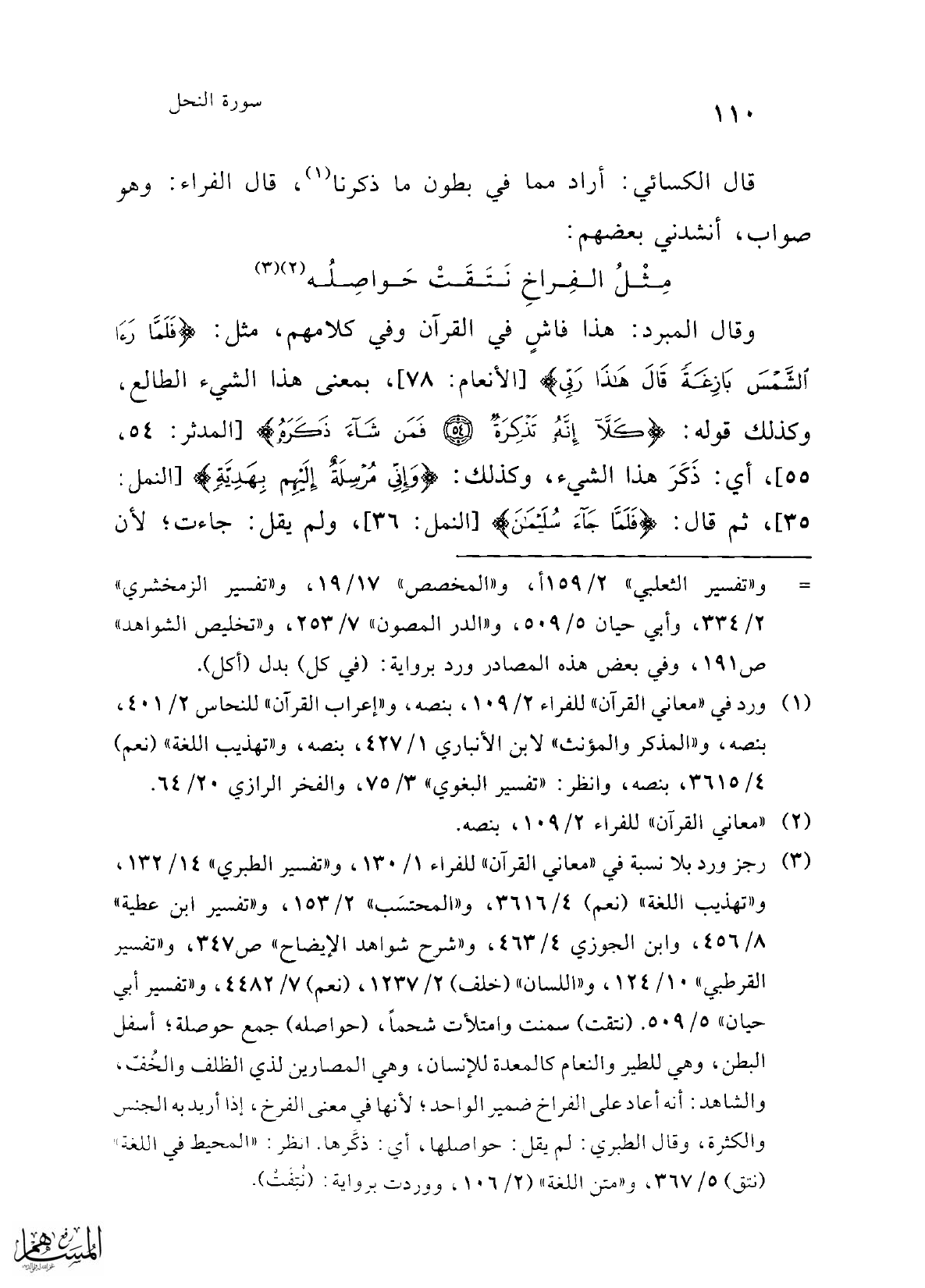 وقال المبرد: هذا فاشٍ في القرآن وفي كلامهم، مثل: {فَلَمَّا رَأَى الشَّمْسَ بَازِغَةً قَالَ هَذَا رَبِّي} [الأنعام: 78]، بمعنى هذا الشيء الطالع، وكذلك قوله: {كَلَّا إِنَّهُ تَذْكِرَةٌ (54) فَمَنْ شَاءَ ذَكَرَهُ} [المدثر: 54، 55]، أي: ذَكَرَ هذا الشيء، وكذلك: {وَإِنِّي مُرْسِلَةٌ إِلَيْهِمْ بِهَدِيَّةٍ} النمل: 35]، ثم قال: {فَلَمَّا جَاءَ سُلَيْمَانَ} [النمل: 36]، ولم يقل: جاءت؛ لأن